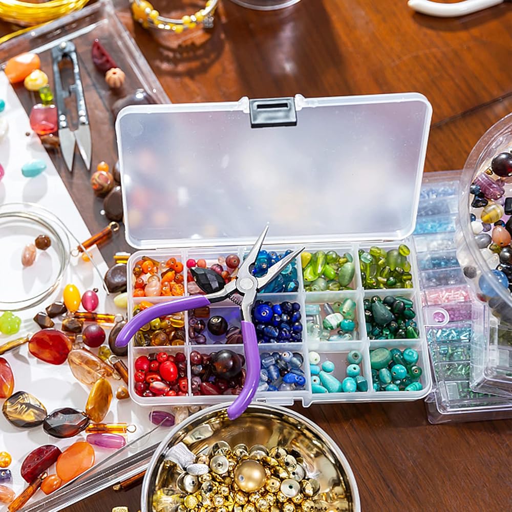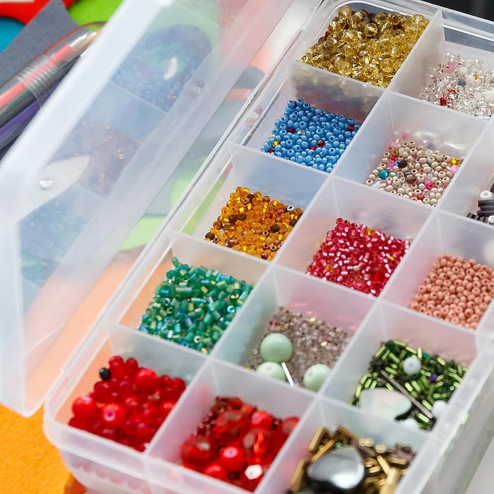 15 COMPARTMENTS BOX - This bead organizer box is see-through plastic. It's designed to keep your beads and other small crafting materials neatly organized. It features 15 compartments, allowing you to sort and store your beads based on color, size, or type.