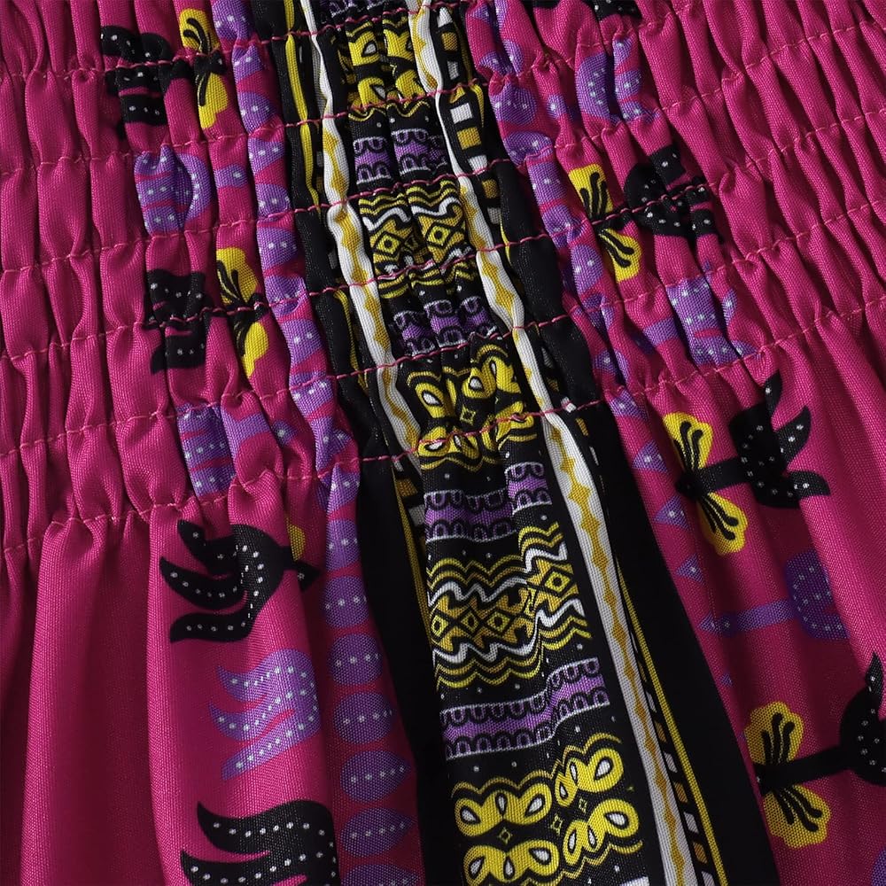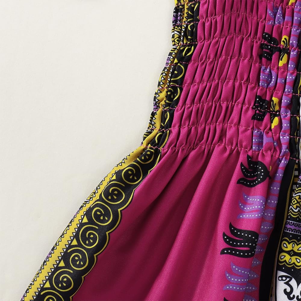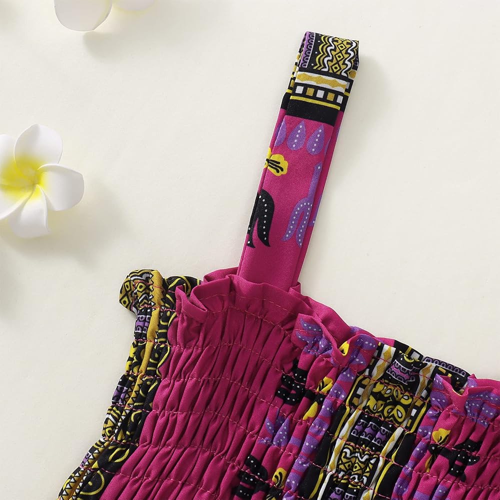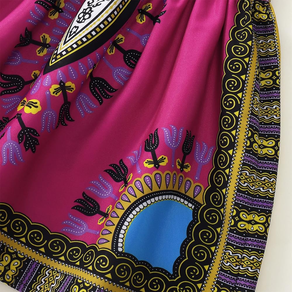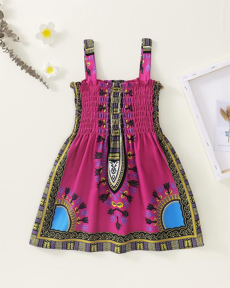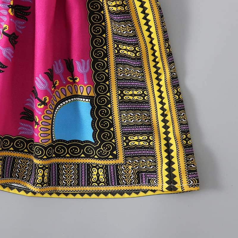 💖 Design: African Ankara Dashiki style clothes for baby girls, Kente style outfit, bright color, African boho dress, Fashion baby girls sleeveless wide strappy, and the symmetrical print looks mysterious and full of African style. It's a layer swing dress, the upper part of the body is elastic design and the lower half of the body is a ruffled large skirt hem. Three classic colors, pink, red, and yellow match the design and is very festive.