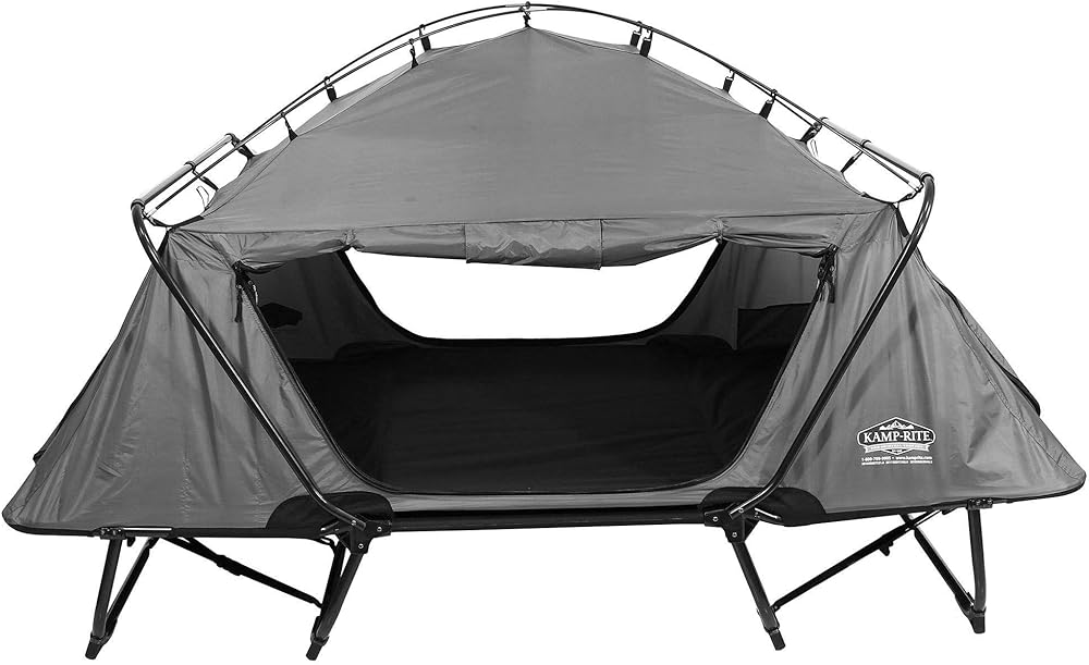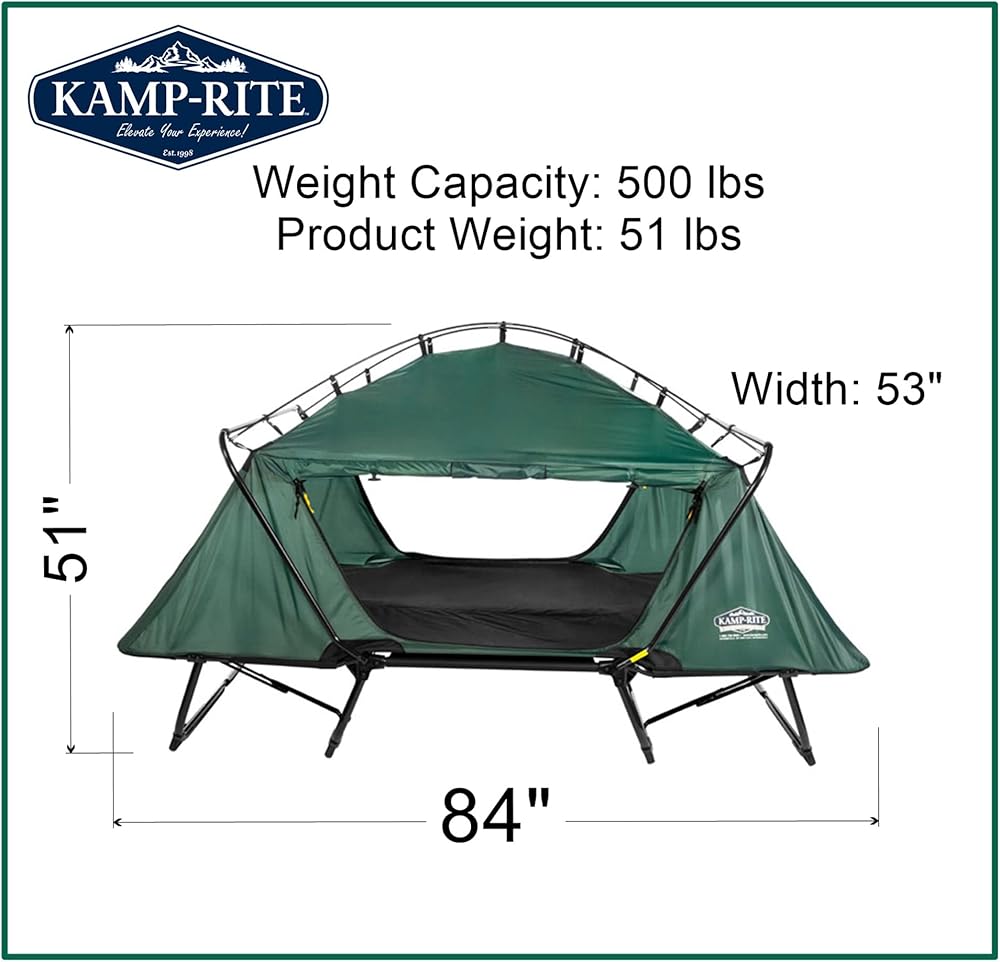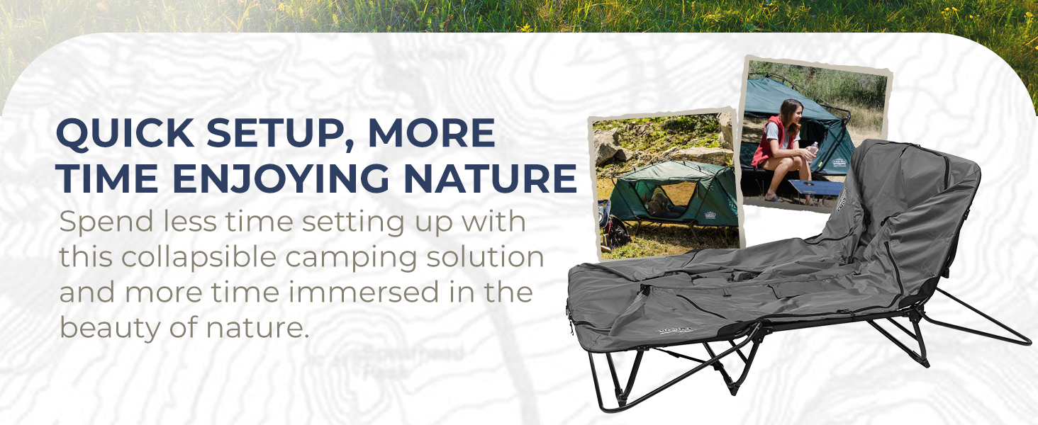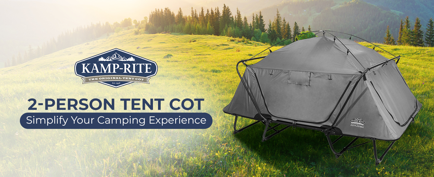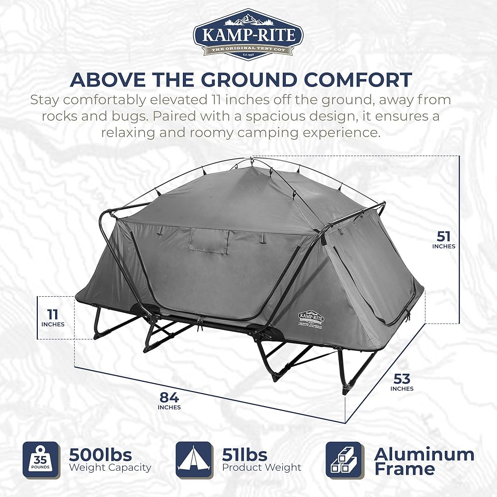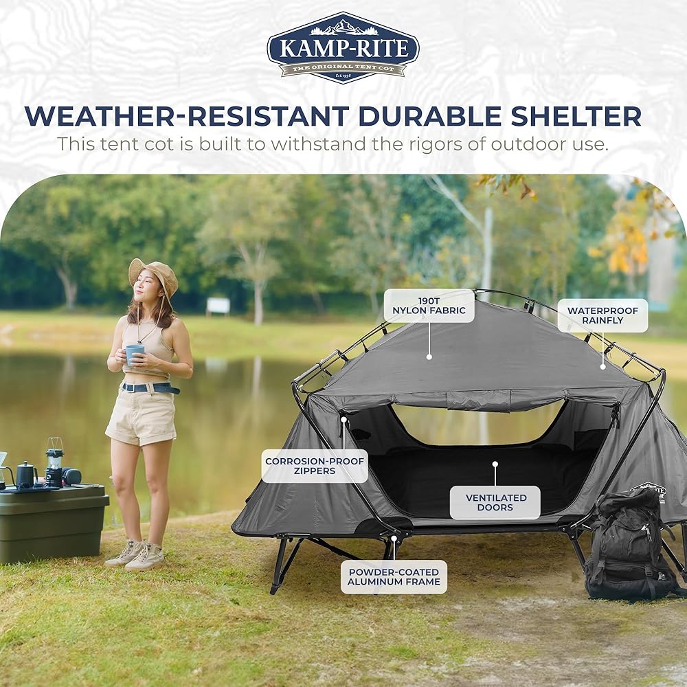 The last thing you want to do is set up a complicated tent at a campsite with friends and family. Streamline your packing load, save time on setup, and maximize your outdoor enjoyment with the Kamp-Rite Double Quick Setup 2-Person Elevated Cot, Lounge Chair, and Tent. This ingenious 2-person haven is a masterpiece of camping gear, expertly crafted with heavy-duty 190T nylon to withstand the elements. Offering a seamless blend of versatility and luxury, it's designed to elevate your camping experience. Designed with unwavering quality in mind, it features top-notch clips and buckles for your safety and comfort. Stay organized and clutter-free with the convenient interior storage pouches, which help you keep your essentials within arm's reach. With a design focused on ease and efficiency, it boasts a quick and easy setup process, saving you precious time while on your adventures. No-see-um mesh on windows and doors keeps bugs out, while the elevated cot and robust aluminum frame ensure comfort and durability in the great outdoors. You can easily open and close it with rust-proof zippers. Its innovative hinge design allows it to transform into a lounge chair or cot, suiting your mood and needs. Spend less time fiddling with stakes and poles and more time taking in the beauty of nature with the Kamp-Rite Double Quick Setup 2-Person Elevated Cot, Lounge Chair, and Tent.