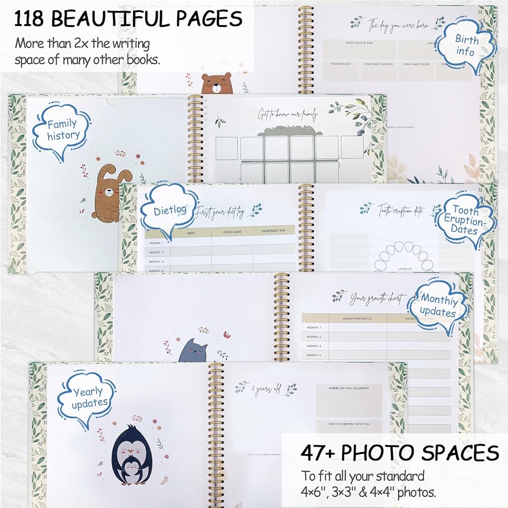 Beautifully Baby Memory Book: It's gold spiral bound, full color print scrapbook type, features gender-neutral woodland theme, and made with heavier archival-grade paper. The memory book has 118 beautifully designed pages and divided into 6 chapters, lots of place to add photo and writing, and very organized so you can easily fill out each section with all the special memories of your little one. Furthermore there's a sturdy protective hardback sleeve to keep your baby album safe for decades.