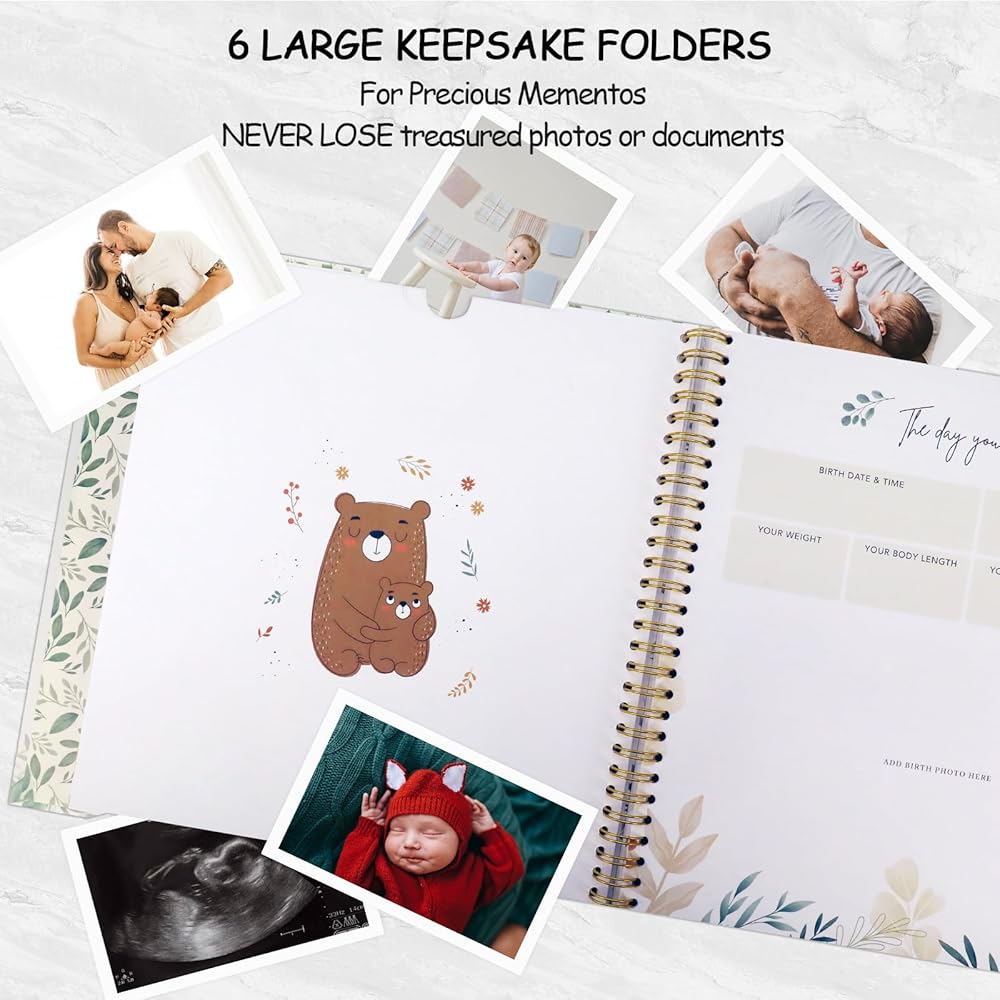 Sweet Memory Album: The baby book is the perfect keepsake to cherish every moment with your adorable baby. It's a baby journal awesome for recording and keeping memories, also a baby photo album which features plenty of free-sized photo area to keep 47 photos. There's included 6 large keepsake folders super handy to save special baby items, extra pictures, and important documents. A album of sweet memories that last a lifetime!