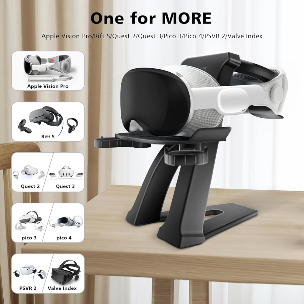 [More Model VR Compatibility] Compatible with most standard-sized VR headsets, including Vision Pro, Series(Quest 2/Rift S/Quest 3), PSVR 2, Valve Index. Standard-sized stand as best show station.