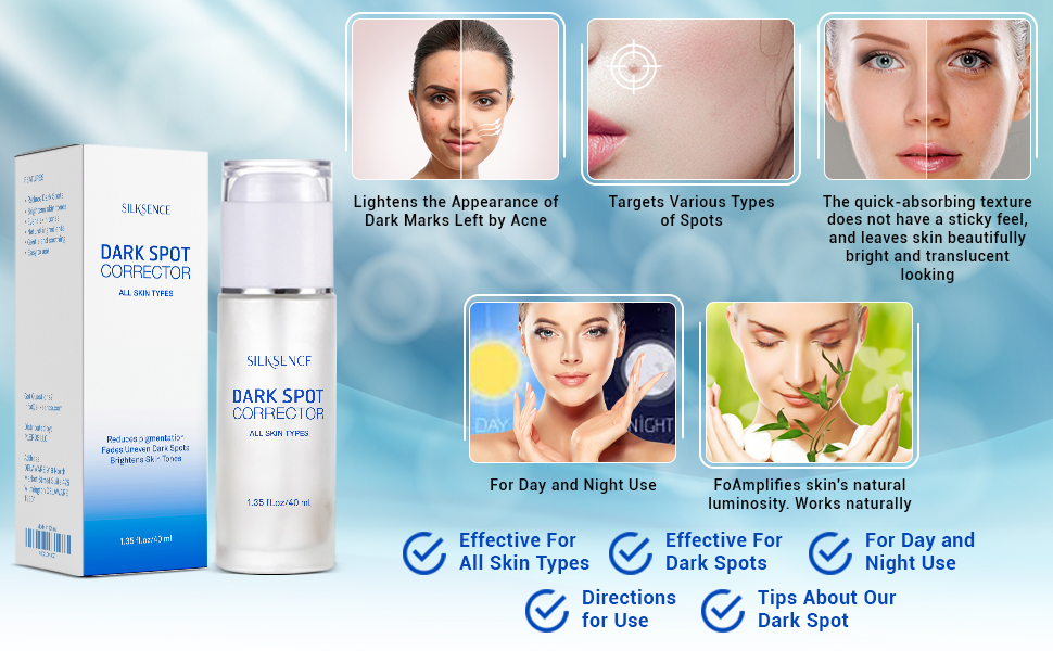 For Day and Night Use. Our dark spot corrector can be used day and night. During the day, dark spot remover for face prevent the damage from the sun, acne scars, and alleviate hyperpigmentation of fresh. And during the night, melasma treatment for face will recover the skin and reduce dark spots, sun spots, dullness, etc.