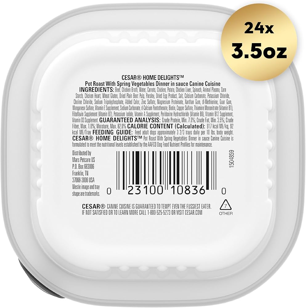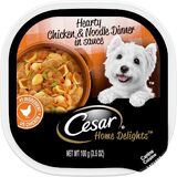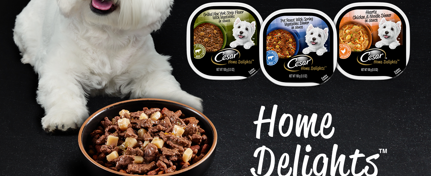 Dogs love the great taste of CESAR Wet Dog food. Crafted with US Chicken as the #1 ingredient, CESAR HOME DELIGHTS Slow Cooked Chicken & Vegetables Dinner is guaranteed to tempt even the fussiest eater. CESAR CANINE CUISINE provides the complete and balanced nutrition your dog needs, with the taste and variety they can't resist. The CESAR brand always makes mealtime easy with convenient trays and no-fuss, peel-away freshness seals. Our gourmet wet dog food uses ingredients formulated to meet nutritional levels established by the AAFCO dog food nutrient profiles for maintenance. Spoil the dog you love with CESAR wet dog food.