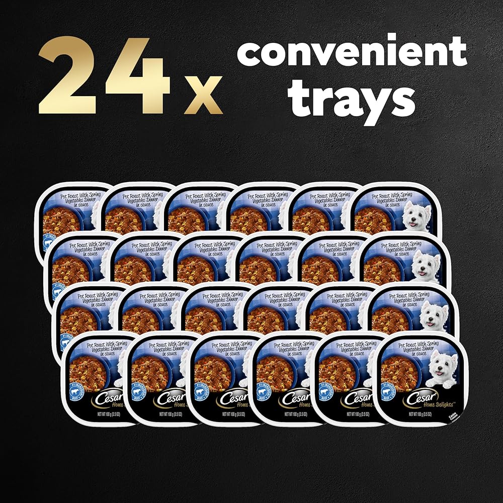 24-Pack: Contains twenty-four (24) 3.5 oz packs of CESAR HOME DELIGHTS Adult Wet Dog Food Slow Cooked Chicken & Vegetables Dinner in Sauce