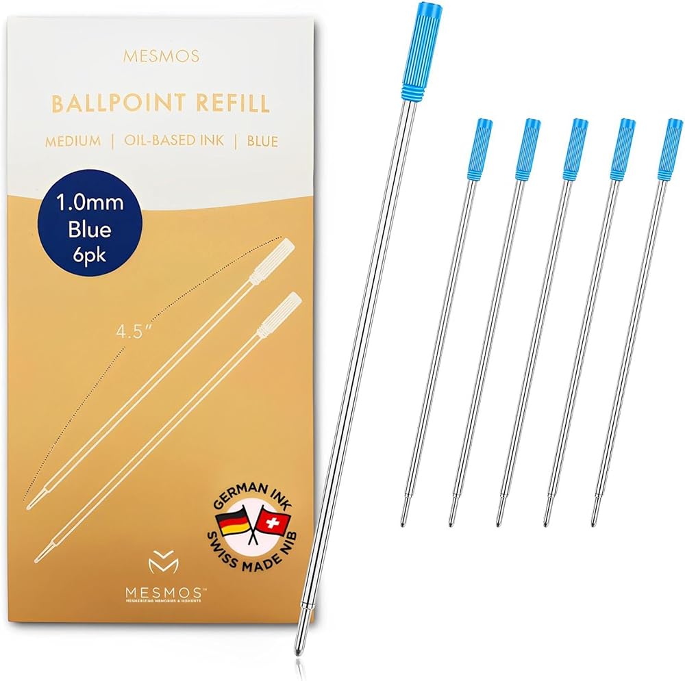 NEVER RUN OUT OF INK AGAIN! Keep using your favorite pen for years to come by refuelling it with the Mesmos 6 pack ballpoint pen refills, featuring high-quality ink made in Germany and precision tips manufactured in Switzerland.