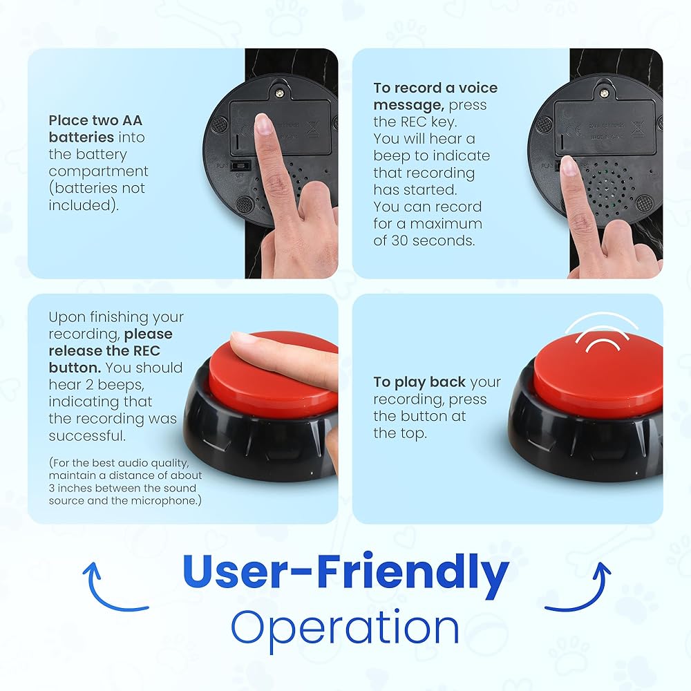 PERSONALIZE YOUR COMMANDS: Record your directives in your voice to fortify the unparalleled bond with your dog. This dog speaking buttons for dogs promote pet communication, allowing you to utilize the unique expressions recognized by your pet.