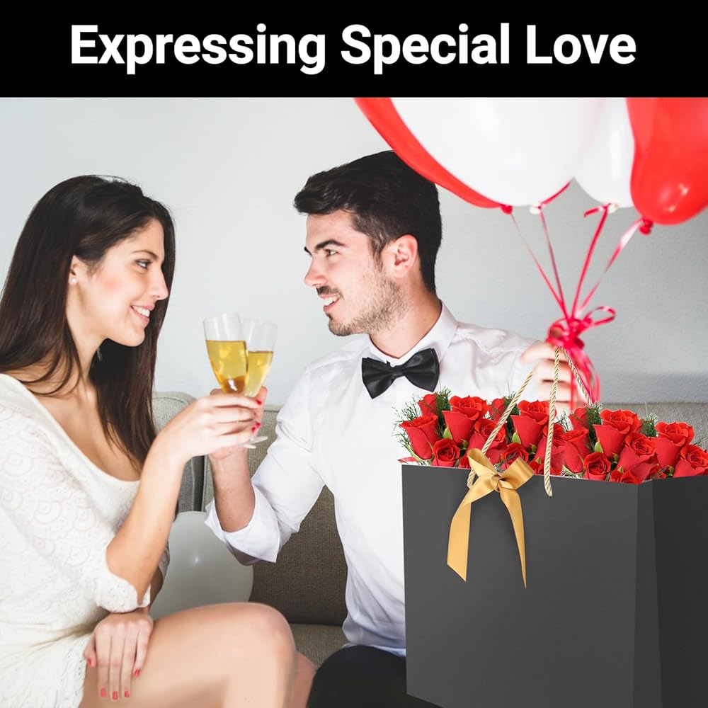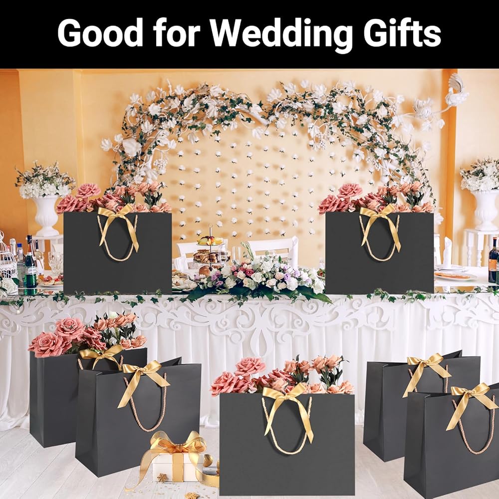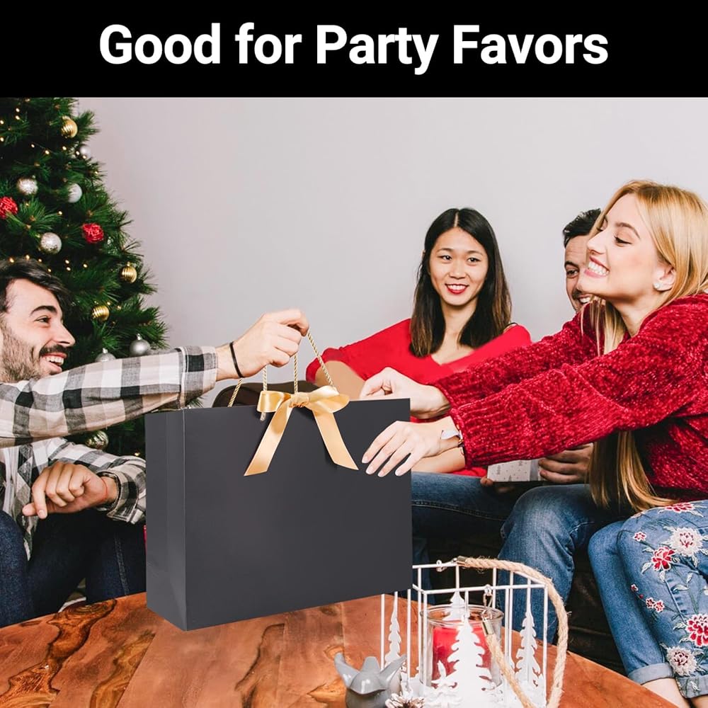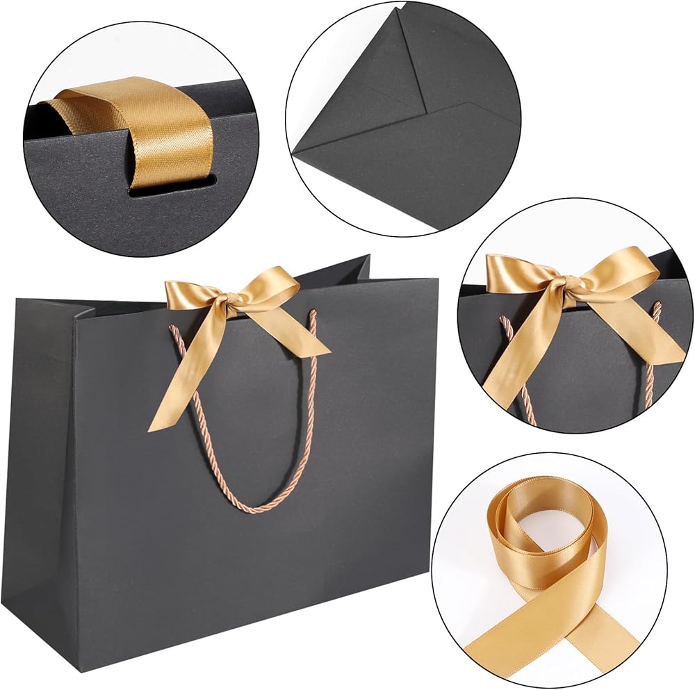 【 Quantity & Size】 Comes with 25pcs of black gift bags with handle and 25pcs ribbon(You need to assemble your own bows), measuring approx. 15.7"x5.9"x11.8", good for storing makeups, clothing, and other party favors.