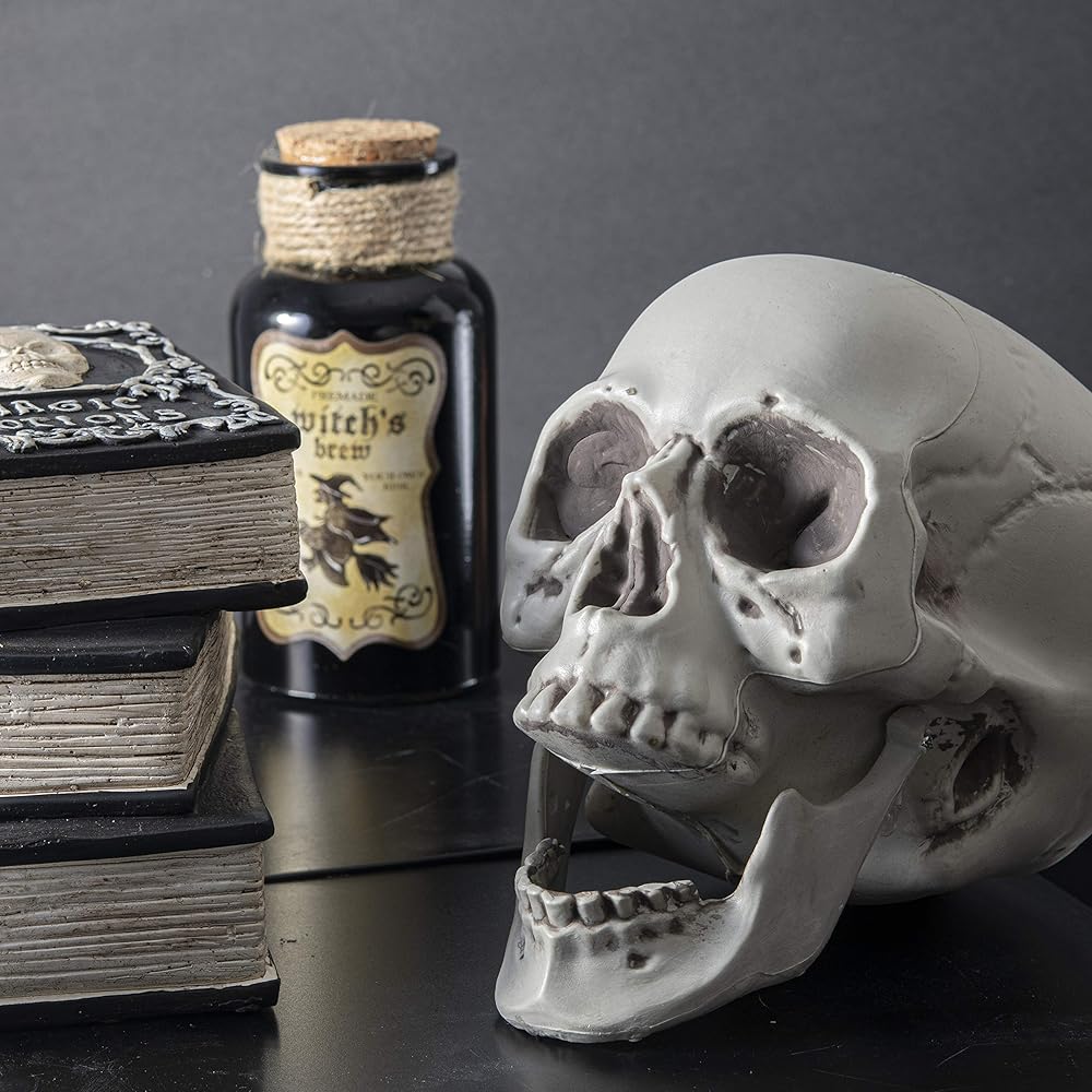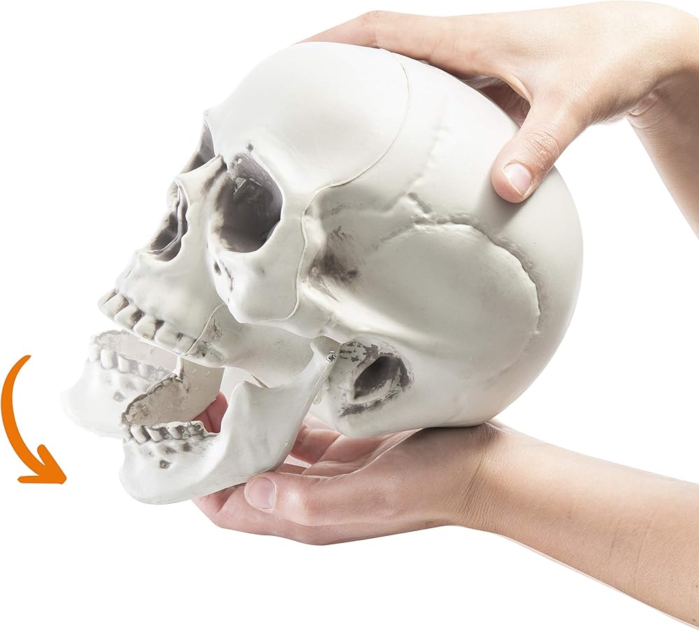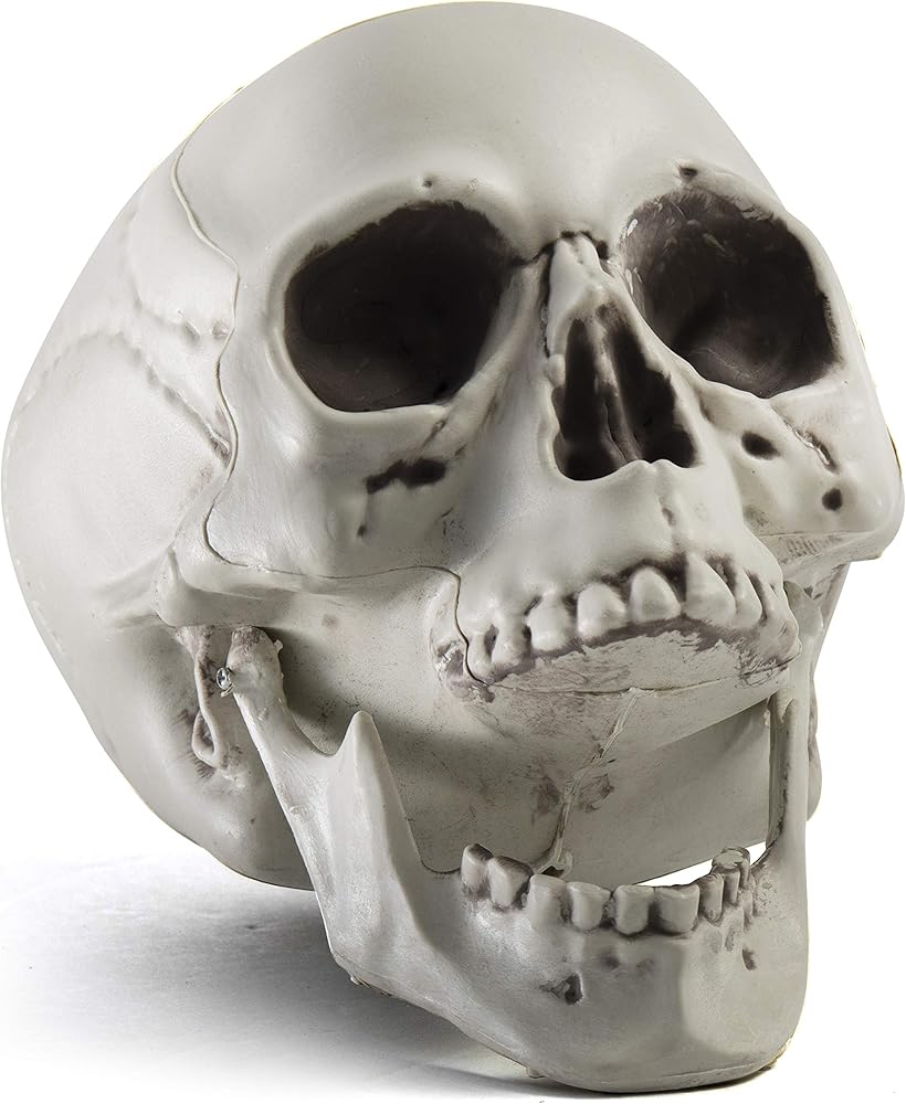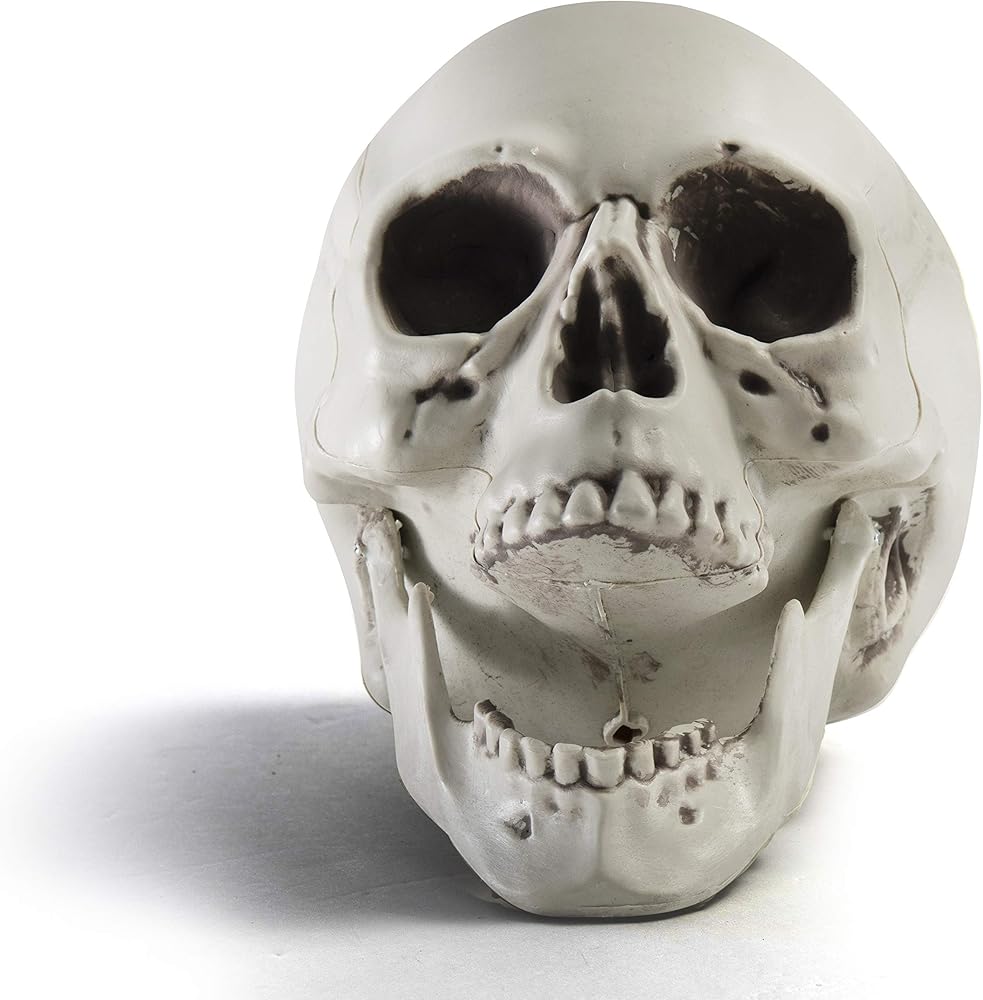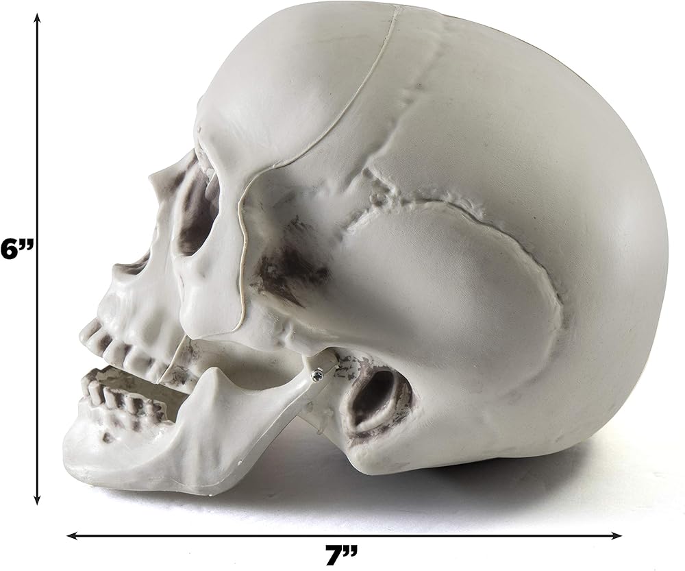 - LIFE SIZE - This life-size skull measures 6.5” with a movable jaw that can be kept open or close.