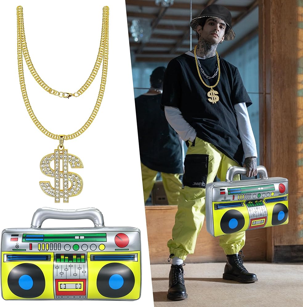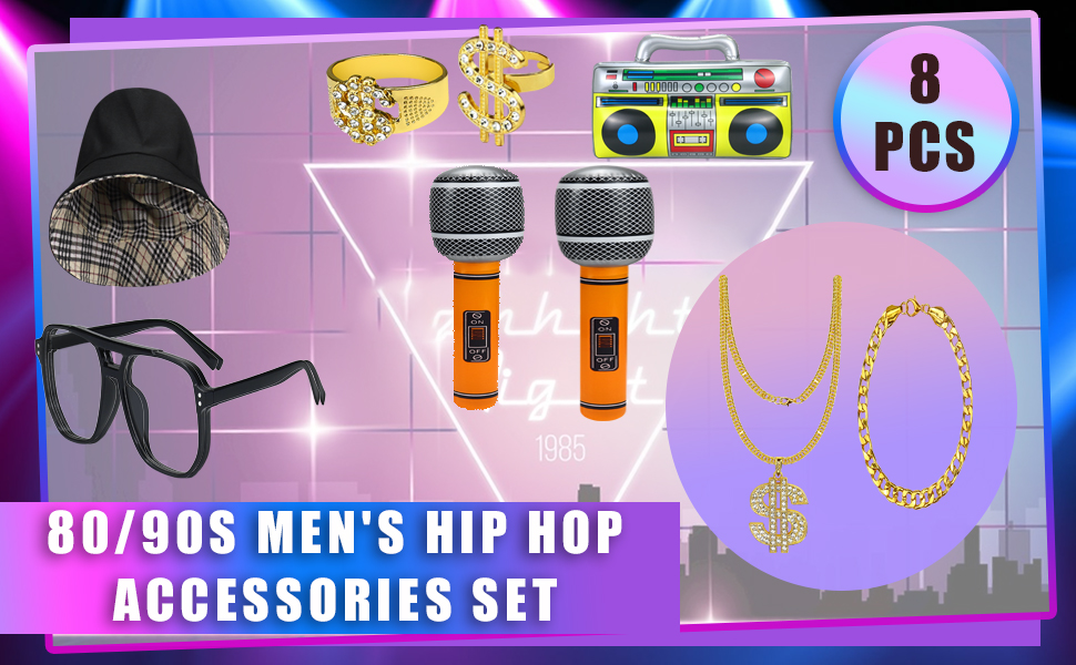 【HIP HOP COSTUME】: This hip hop costume kit includes 1 piece black sunglasses, 2 piece fake gold rings, 1 pcs black bucket cap, 1 pcs dollar pendant necklace , 1 piece fake gold bracelet, 1pcs inflatable radio, 2 pcs inflatable microphones, perfect hip hop costume for your 80s/ 90s dress up, so that you can stand out in the crowd and release the brilliance.