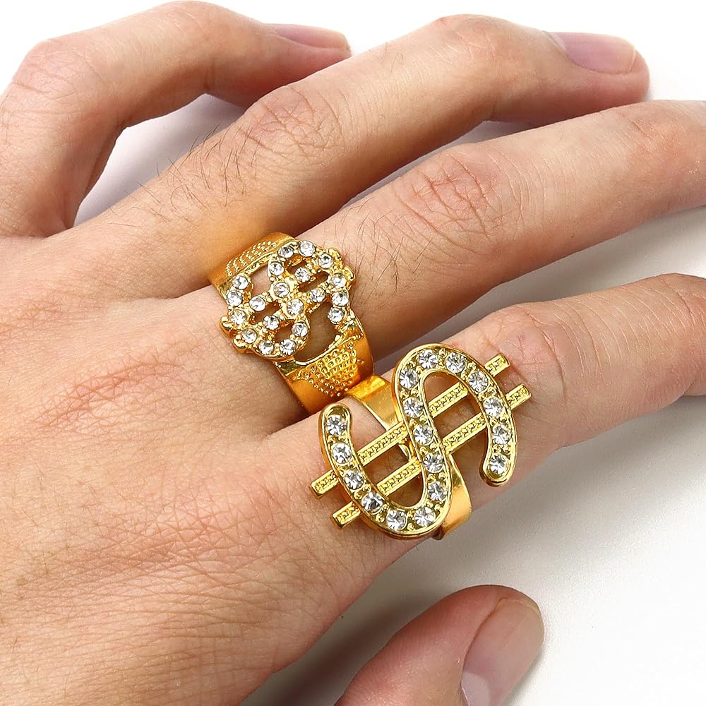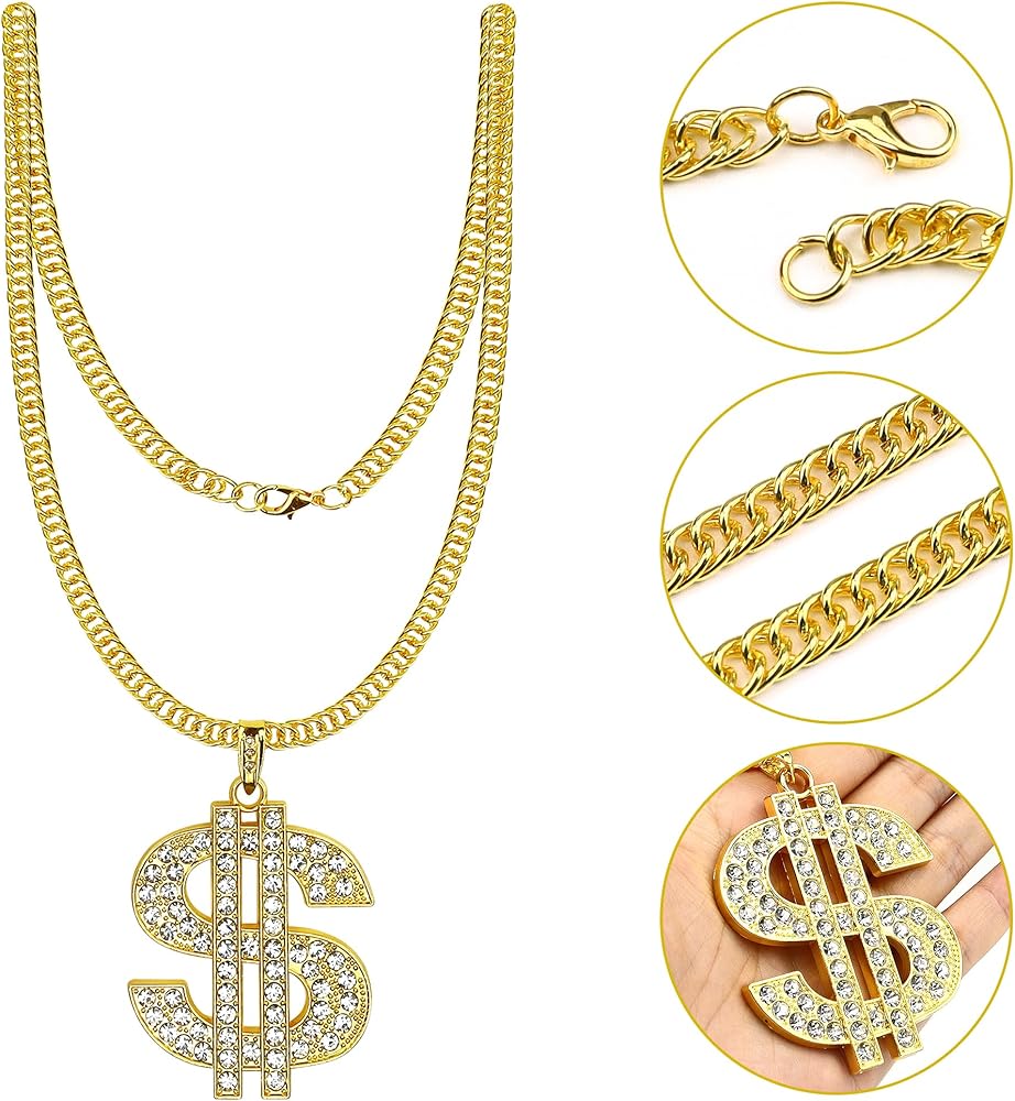 【Faux Gold Necklace / Bracelet / Ring】: The bracelet, rings and the dollar pendant necklace are made of quality metal that has metal luster (environmentally alloy), highly resistant to rust and corrosive buildups, not easy to fade and to get rusty. No smell, not easy to fade, whether it is for 70s/80s parties or everyday life is very suitable.
