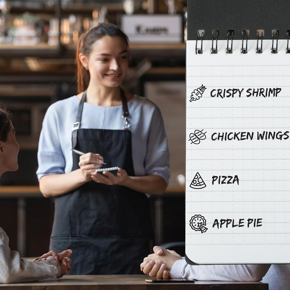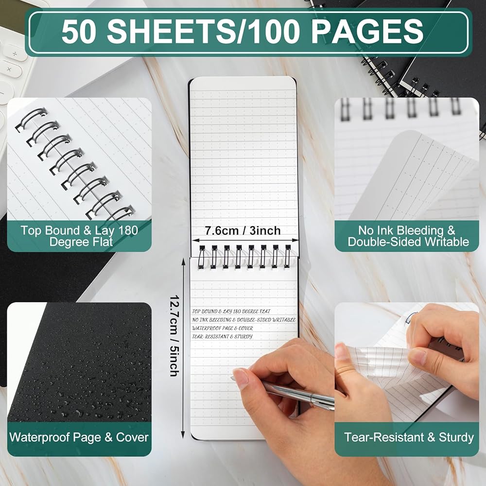 • Waterproof Paper: the waterproof notebook is made of 120 gsm rainproof paper, 100 pages/ 50 sheets per pocket notepad; All weather paper won't turn to mush when wet and will repel water, rain, snow, tears, sweat, grease, mud, and even survive the accidental laundry mishap; Suitable for outdoor recording works and kitchen to keep your writings safe