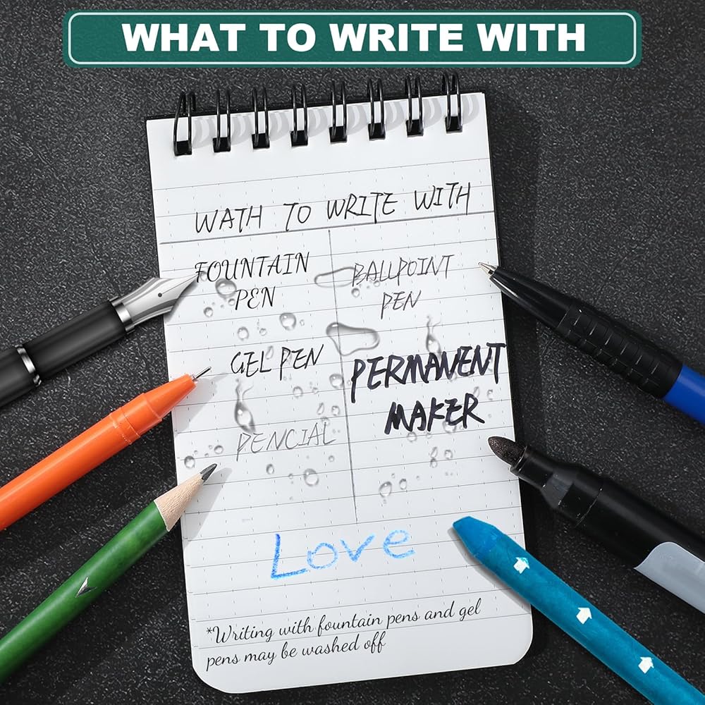 • Writing in the Rain: you better use a pencil or all weather pen for your notes will stay intact; Standard ballpoint pens will work when paper is dry; Water based inks will bead off paper sheets; Suitable for outdoor enthusiasts who can record the camping data and tactical in time, taking it with you without worrying about hiking and camping in bad weather