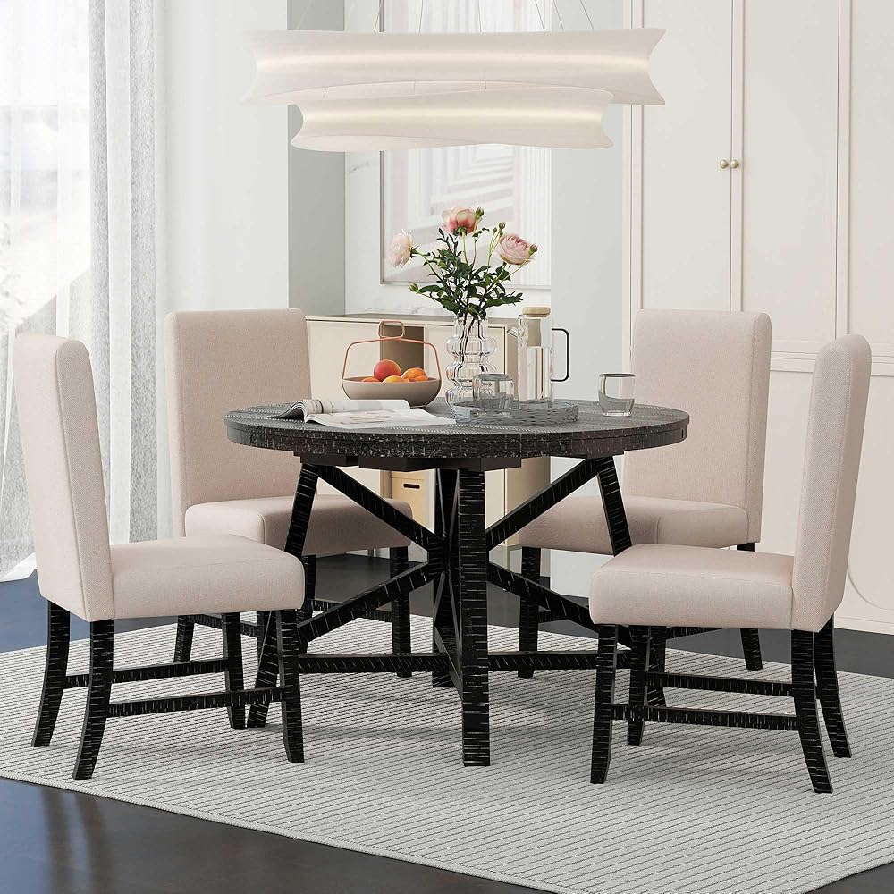 Retro Style: This retro functional dining set includes an expandable round table and four upholstered dining chairs. There are two colors to choose from, black and natural wood wash. The simple colors reveal a low-key taste, making this dining set more textured. No matter which color you choose, it will add a rich retro flavor to your dining room and kitchen, and make your home decoration more comfortable and natural.