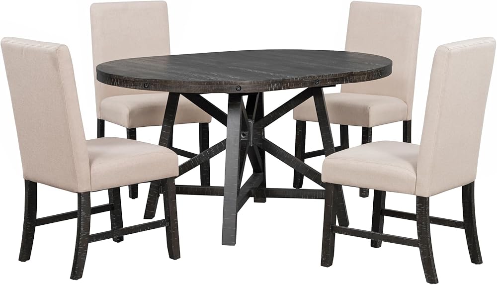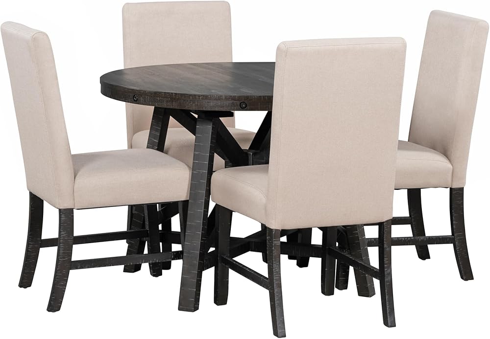 Superior Quality: The tabletop is made of high-quality MDF with acacia veneer. Table and chair legs are made of solid rubber wood, which ensures stability and durability. The surface of this dining set feature meticulous oblique scraping serrated print, making this set more attractive. The four chairs are wrapped in linen as seat cushions, providing a comfortable seating experience. The table has a weight capacity of 300 lbs and the chairs have a weight capacity of 250 lbs/piece.
