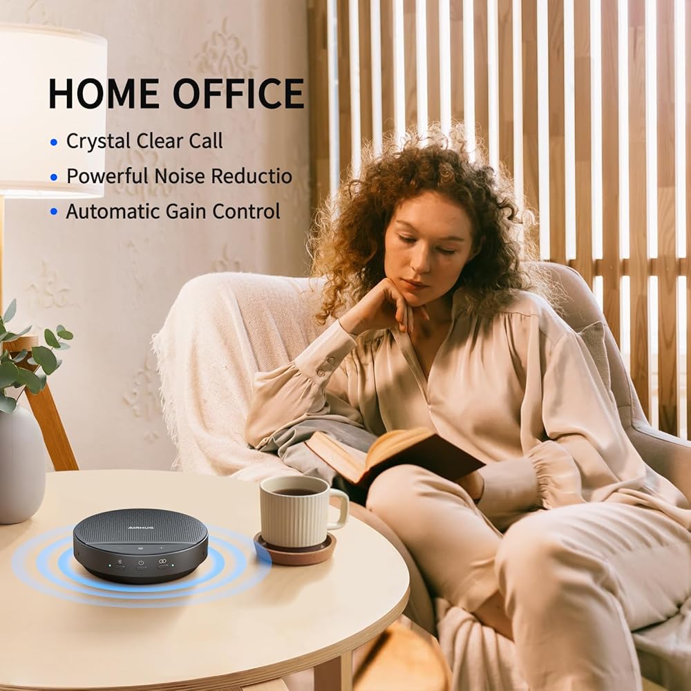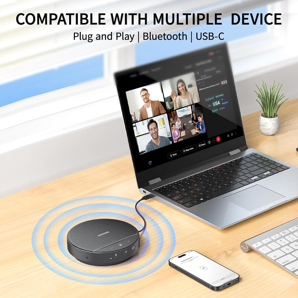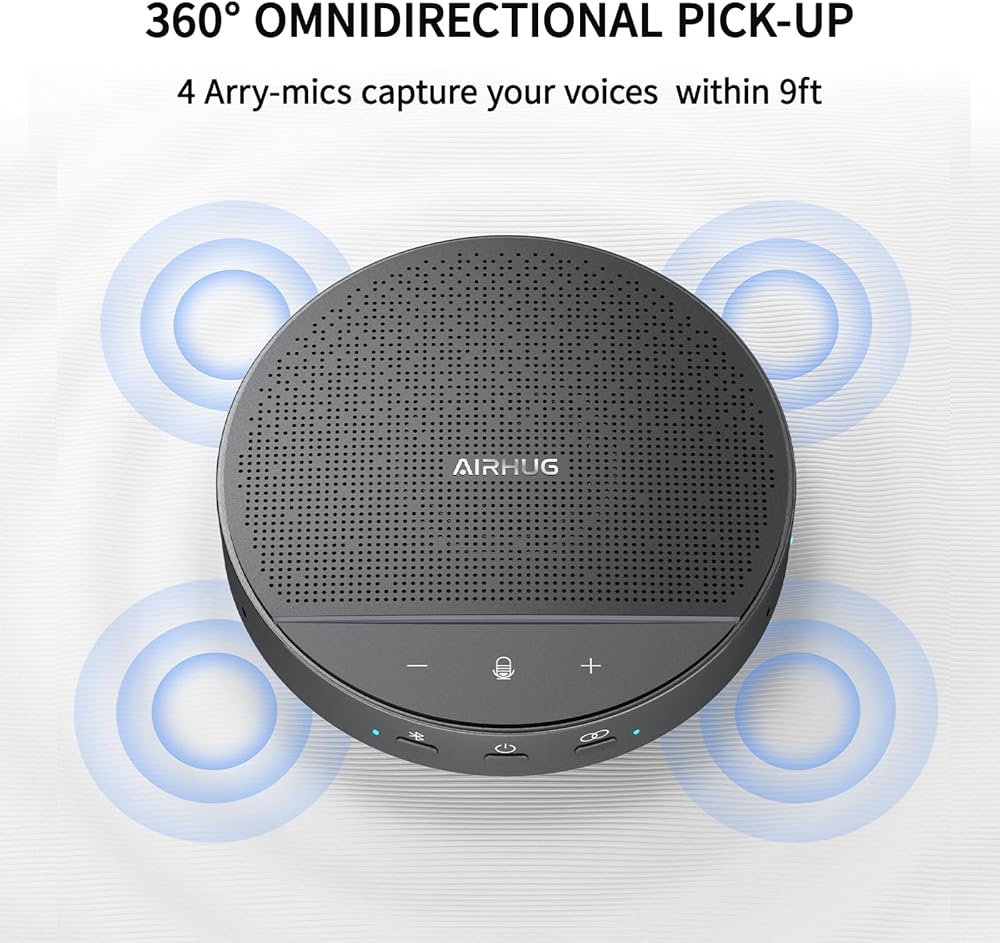 AIRHUG Bluetooth Speakerphone,Conference Speaker and Microphone, 4 Mics 360°Voice Pickup, Noise Cancellation, USB-C Plug and Play, Connect 2 Speakerphones via Bluetooth for 8 attendees