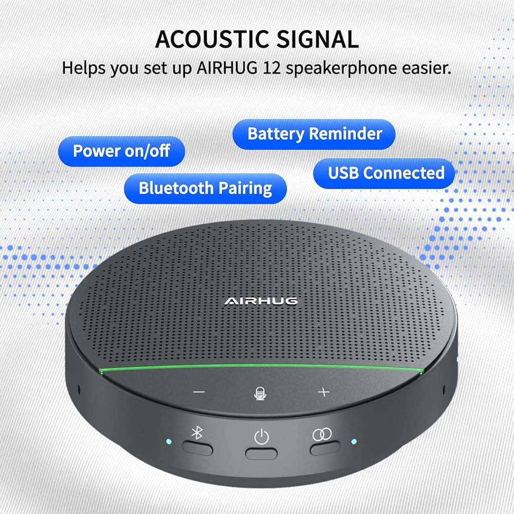 【Acoustic Reminder】 You will be easy to control the AIRHUG 12 speakerphone. AIRHUG 12 provides the acoustic signal reminder when you operate power on/off, bluetooth connection and linking mode. Please note that the acoustic signal reminder can not shut down.