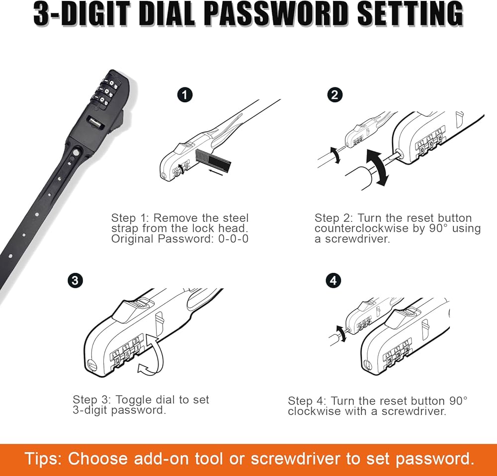 • LIGHTWEIGHT& KEYLESS DESIGN - A 3-digit Resettable Adjustable Combination Lock is a versatile and convenient security option. Lightweight and portable, this lock eliminates the need to carry extra keys. You can easily hang it on your bike or put it in your backpack for use anywhere. It comes with a unique setting wrench tool that allows you to customize your password quickly.