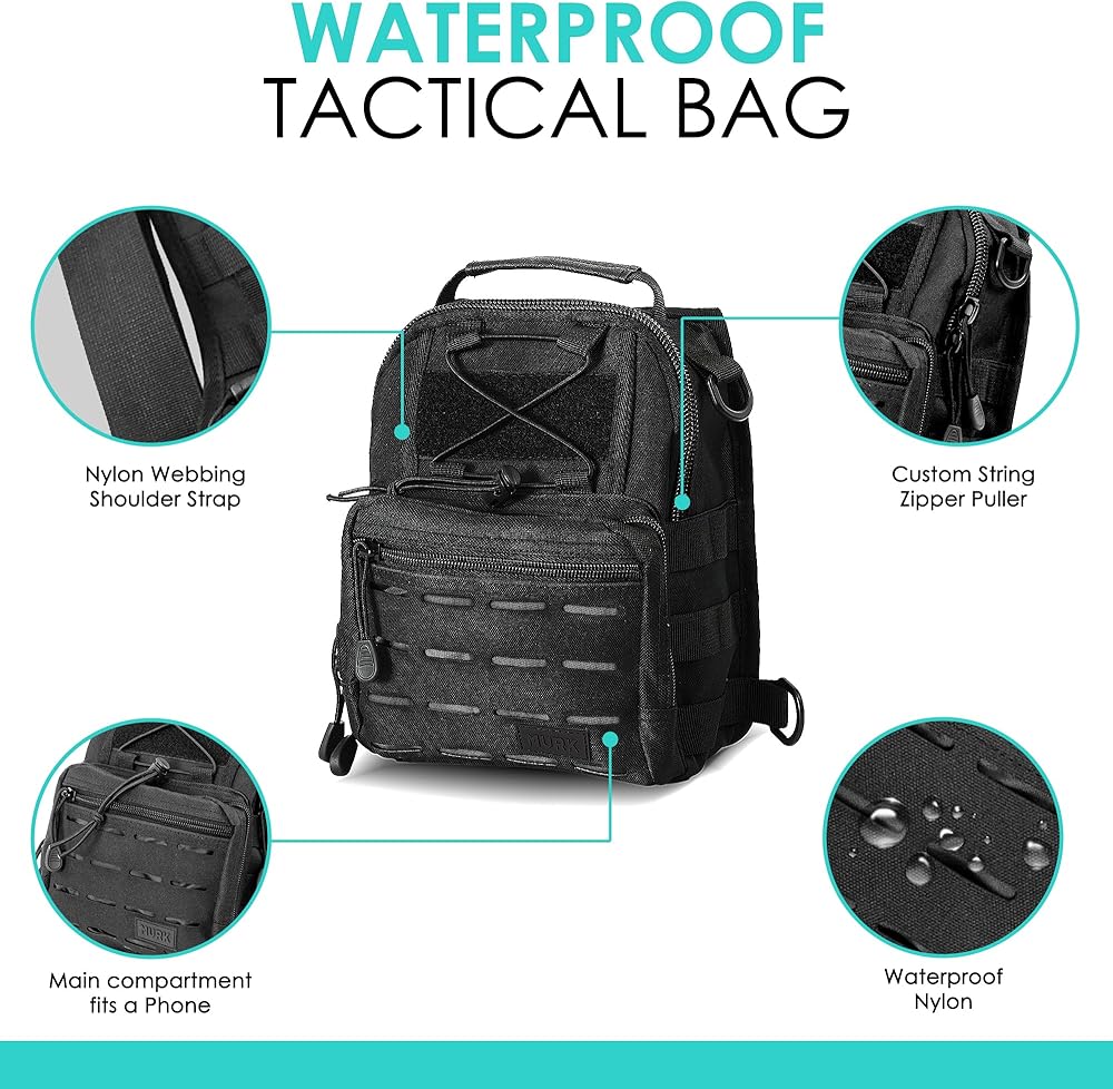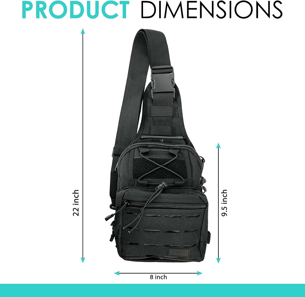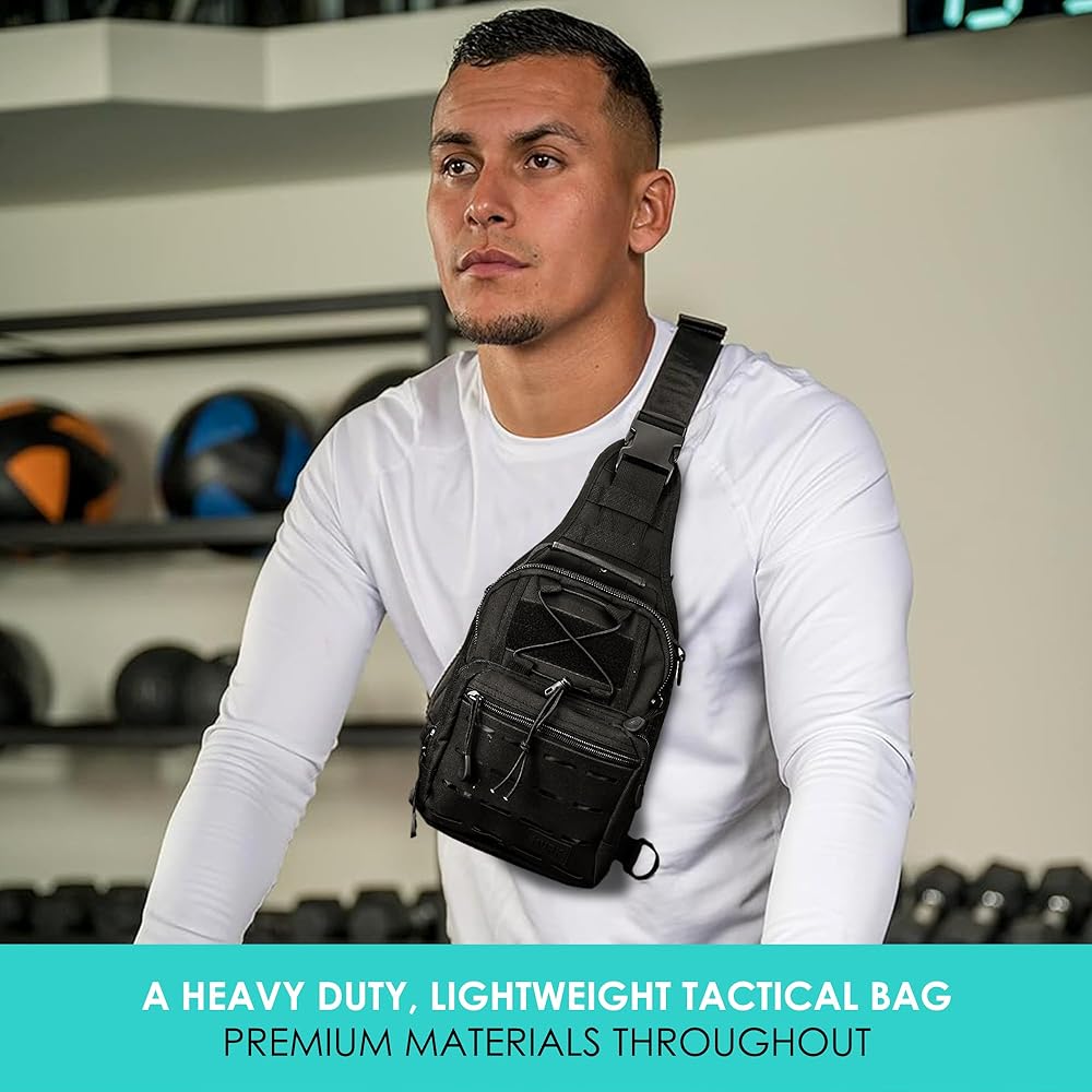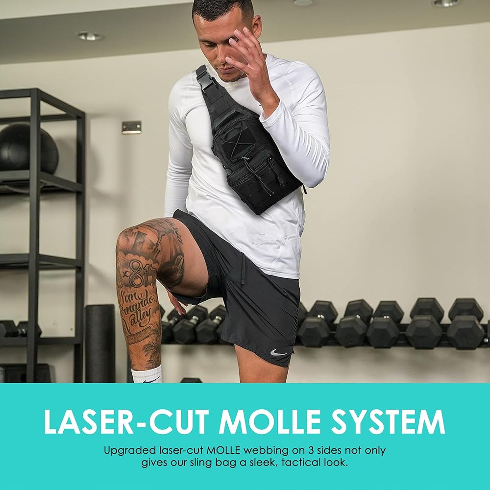 PRECISION LASER-CUT MOLLE SYSTEM: Enhanced with a state-of-the-art laser-cut MOLLE webbing design on three sides, our sling bag not only boasts a streamlined appearance but also provides the flexibility to augment its storage capabilities. Effortlessly affix extra MOLLE pouches and equipment to accommodate a wider array of range, and survival gear, ensuring you're fully prepared for any mission or excursion.