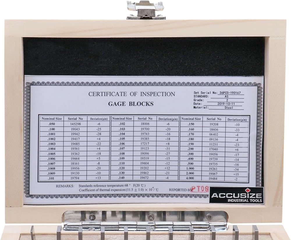 - All gage block sets are assigned serial numbers and are accompanied with a certificate of inspection listing the deviation for each block