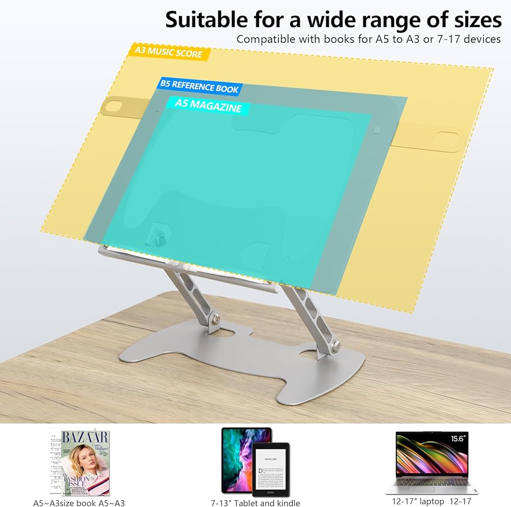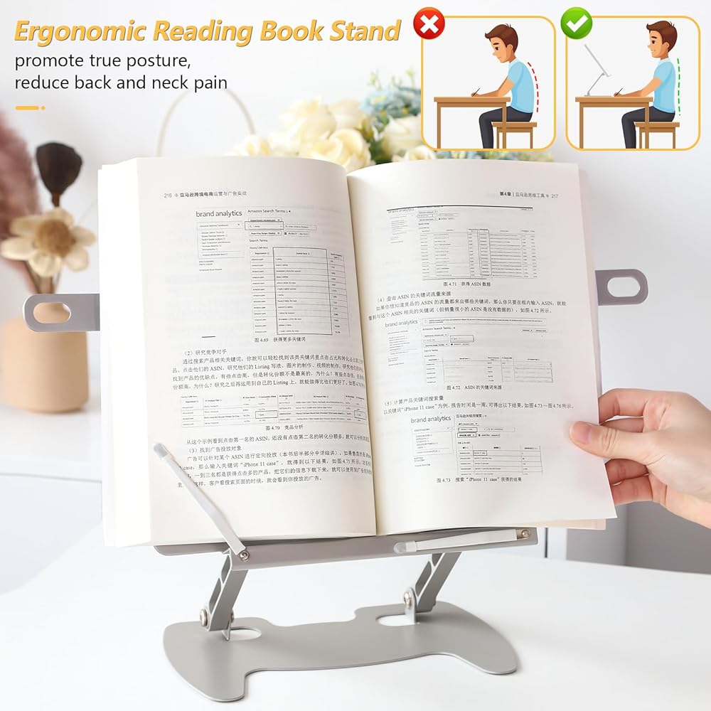 Ergonomic Hands-Free: Elevate your books to eye level for a better reading experience with our ergonomic bookshelf. It helps improve your posture, reduce neck, back and shoulder discomfort, improve concentration and learning, and extend reading time.You can easily adjust the angle and height of your reading material, so no more straining or hunching over while reading. It's also perfect as a cookbook stand, recipe bookholder,paper/magazine holder.