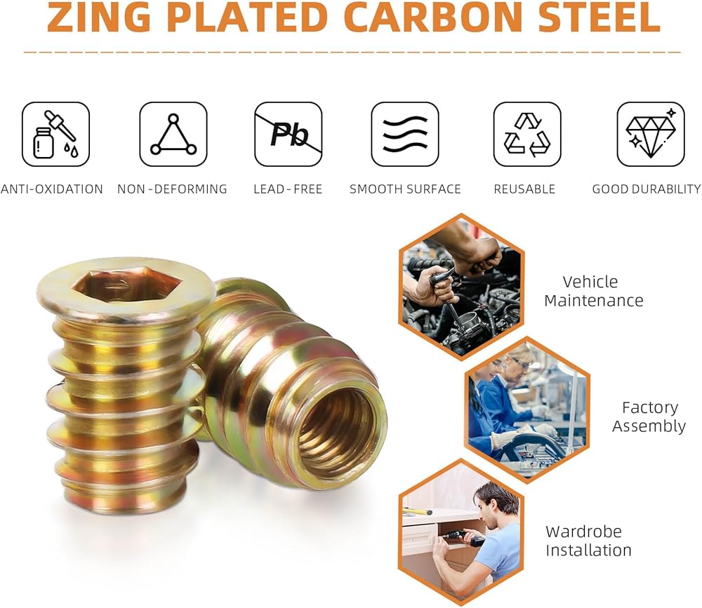 The carbon steel has high hardness and enables the threaded insert to withstand a huge load and remain sustainably; The surface is Zinc Plated, smooth and burr-free so that it has high hardness, wear resistance, good rust resistance.