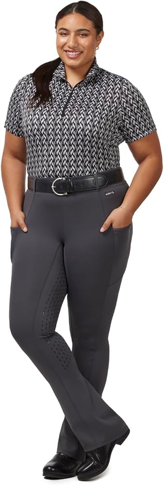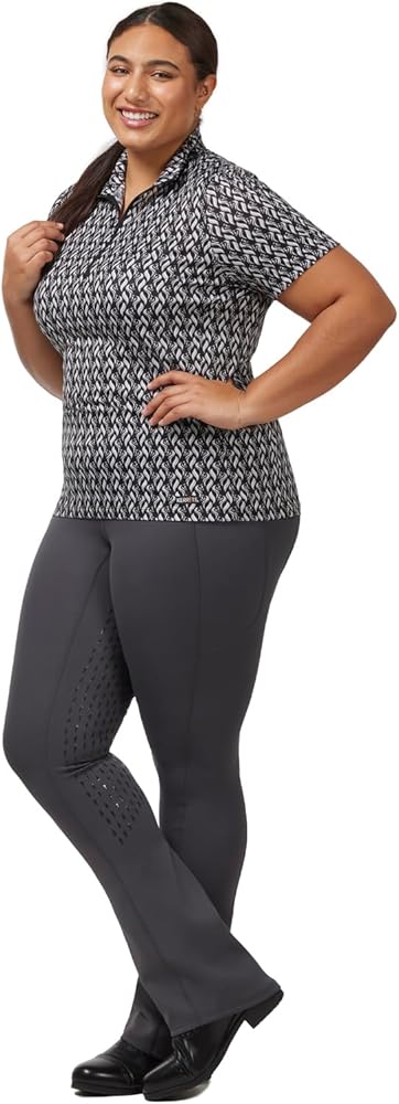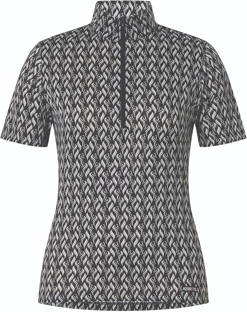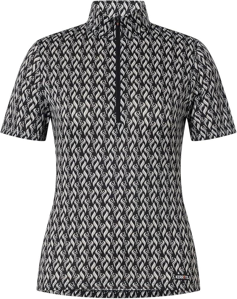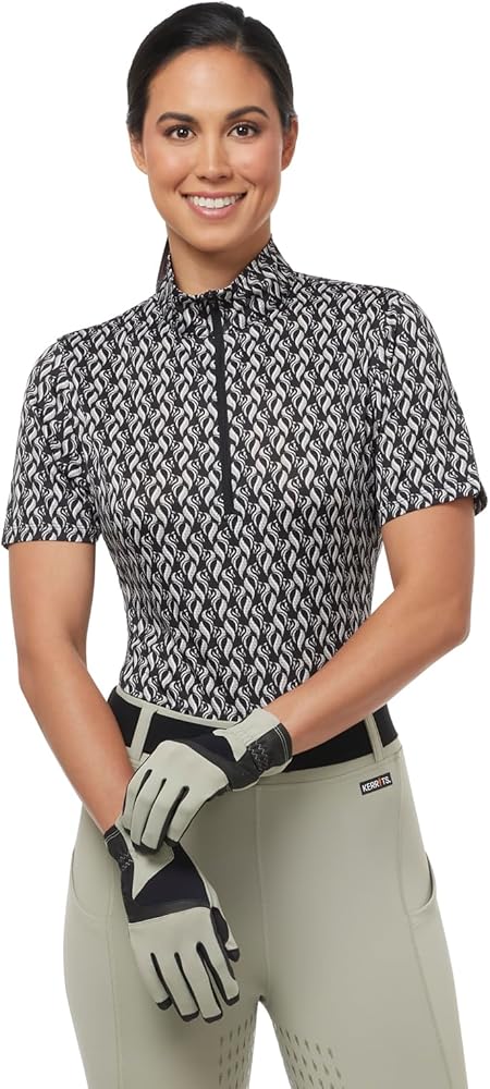 Kerrits Summer Ride IceFil Print Short Sleeve Canter on in the coolest style with equestrian-inspired prints on featherweight Ice Fil(R) fabric that lowers skin's surface temp by up to five degrees. Longer, nine-inch sleeves add coverage while relaxed fit and ten-inch zip welcome the breeze with each stride. Fun patterns from tiny geometric to big and bold let you express your style (and camouflage dirt). Pockets keep treats close at hand. Features: Ice Fil(R) Lite fabric technology converts sweat into cooling energy by reducing skin's surface temp by up to five degrees Highly functional in high-heat conditions: lightweight, breathable, and quick drying UPF+30 sun protection Kerrits exclusive equestrian inspired prints flatter, camouflage and hide dirt Relaxed, yet feminine fit Ten-inch zip for extra ventilation Nine-inch sleeve length provides added sun protection Two low-profile back hip pockets Equestrian shaped hem helps keep shirt tucked in while riding 90% polyester / 10% spandex Wash cold, tumble dry low