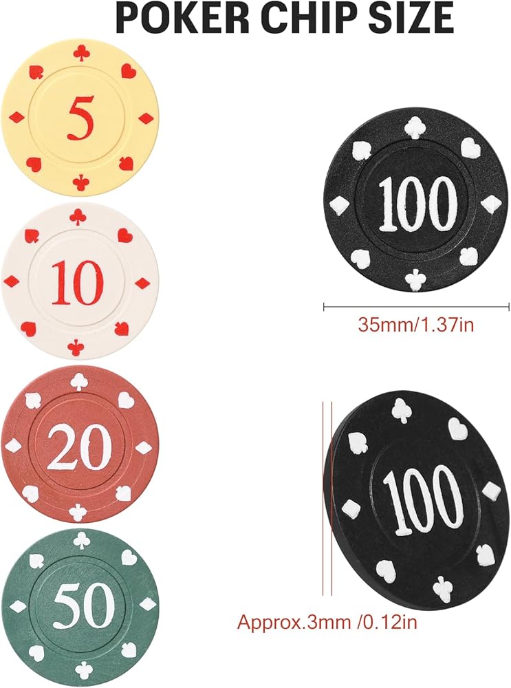 Size & Denominations : Numbered poker chips is about 3.5 cm/1.37 in in diameter, about 0.3 cm /0.12 in thickness. Denominations are 5/10/20/50/100. Small compact, light and portable, convenient for you to carry or store.