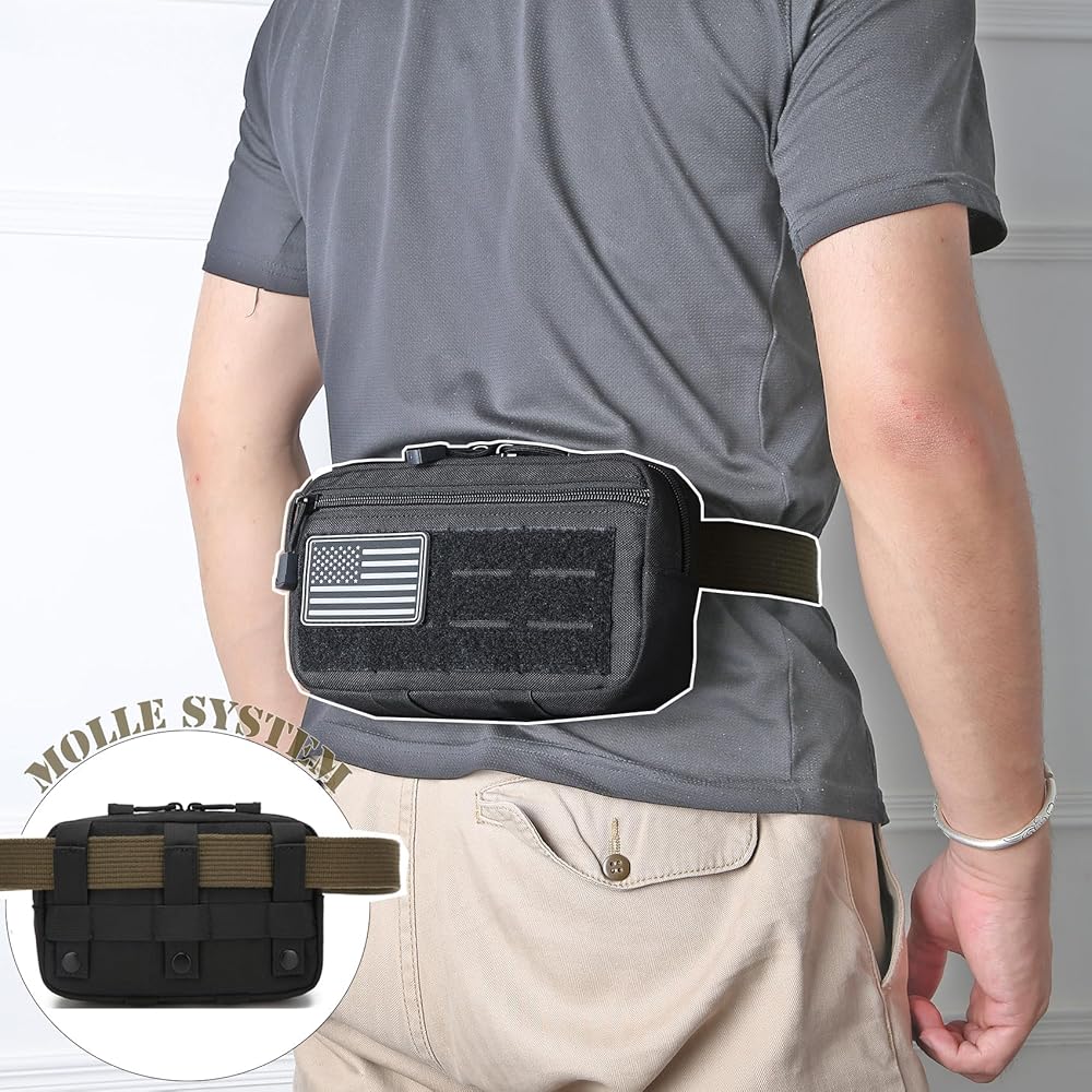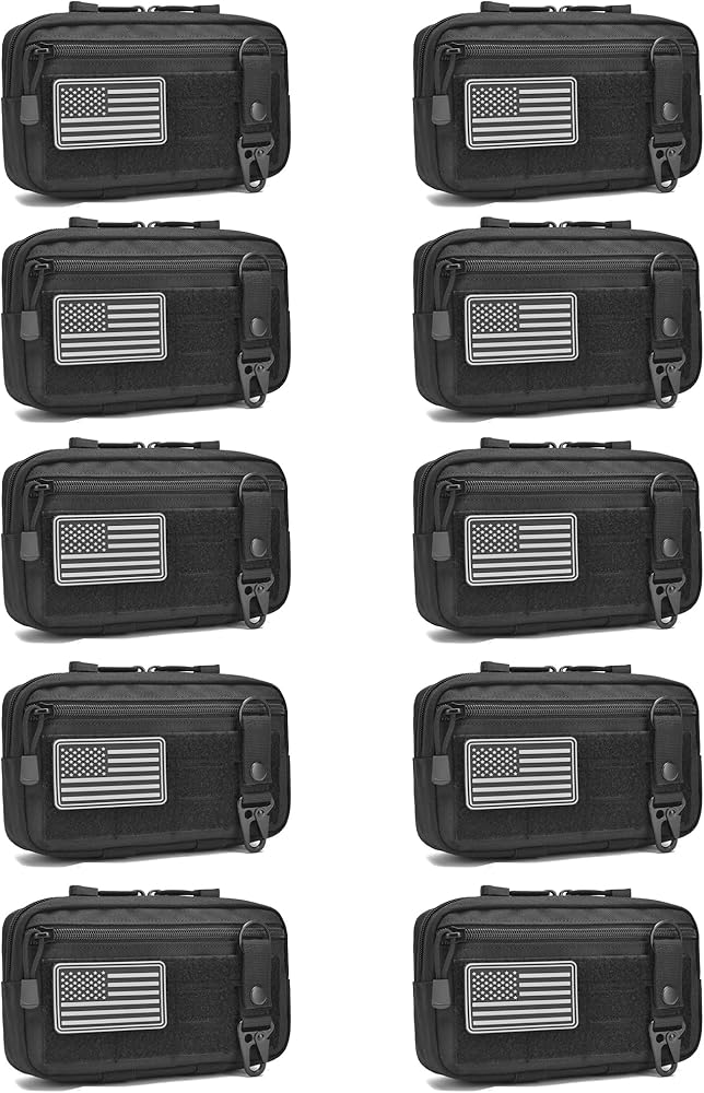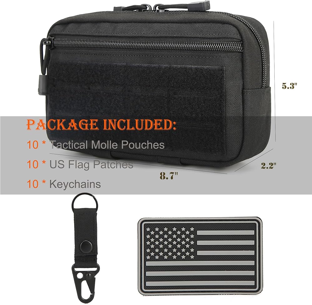 Package Included:2*Tactical Molle Pouches +2*US Flag Patches+2*Keychains ✅TOUGH QUALITY: Admin pouch size: 9" x 5.3" x 2.2". Made of tough, durable and lightweight 1000D nylon.Sturdy double zippers for the top to the sides quickly allow it to fully open and lay flat.Easily see what you have.The sturdy Molle system and copper snap button make it more firmly attached to other tactical gears.