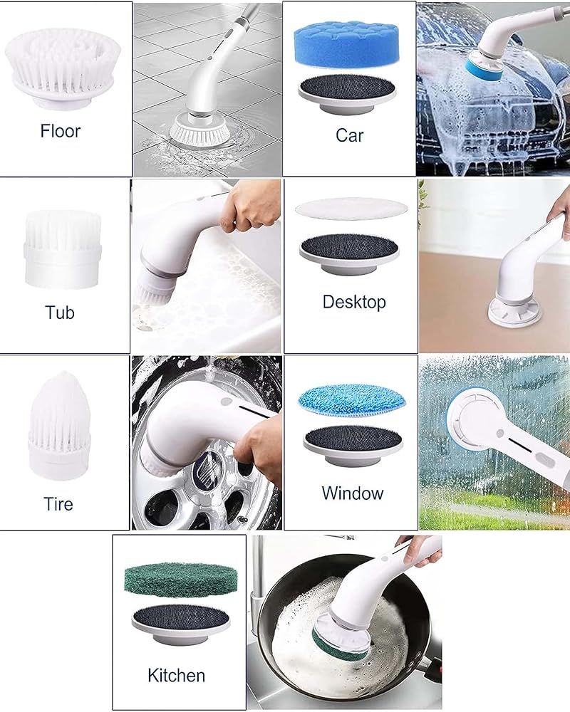 【Upgraded 8-in-1 Scrubber】8AMTECH electric spin scrubber is equipped with extendable stainless-steel handle and 8 replaceable brush heads. The handle can extend from 12" to 54" and is easy to clean hard-to-reach places, without bend your knees. Say goodbye to the traditional cleaning and enjoy the convenience of science and technology to life.