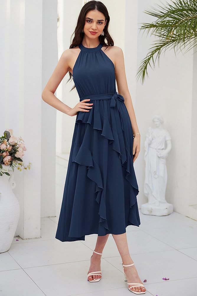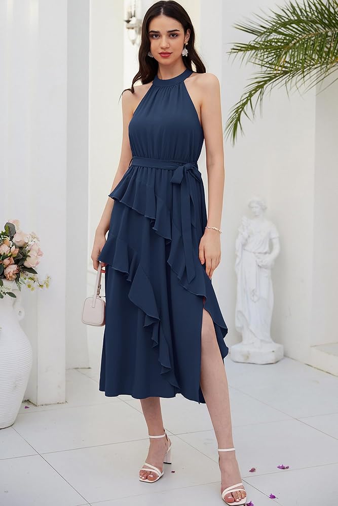 Size Attention: S=US 4-6, M=US 8-10, L=US 12-14, XL=US 16-18. This halter neck dress is made of premium material, soft, lightweight and breathable, with comfy lined. Not see through, comfortable to wear in summer. The halter sleeveless ruffle maxi dresses should be the new trendy womens summer dresses for women 2024.