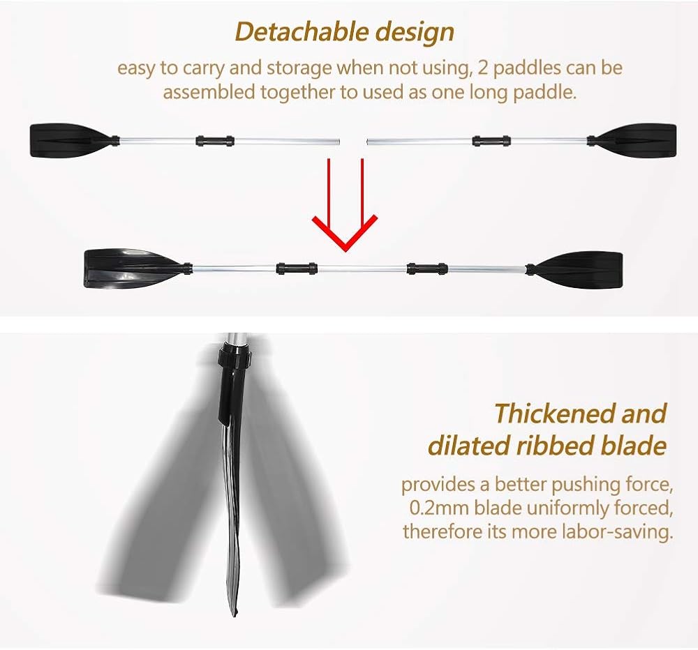 Detachable design, easy to carry and store when not in use, 2 paddles can be assembled together to be used as one long paddle.