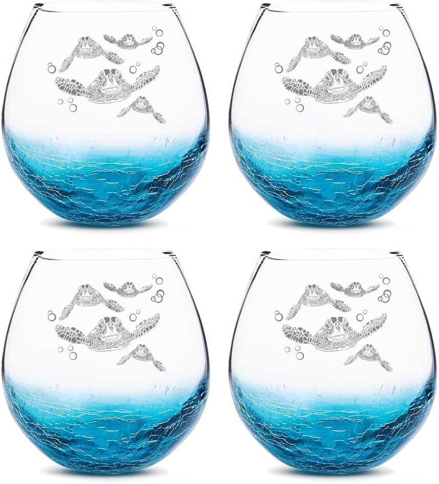 تذكير بالحب: يتميز كأس النبيذ الجميل هذا بـ 4 سلحفاة بحرية منقوشة على خلفية فيروزية متصدع، كما لو أن السلحفاة البحرية الأربعة المحفورة تسبح بسعادة داخل كأس النبيذ، وحبهم لبعضهم البعض مؤثر للغاية. إنه يذكرنا بأن نعتز بعلاقاتنا مع أحبائنا.