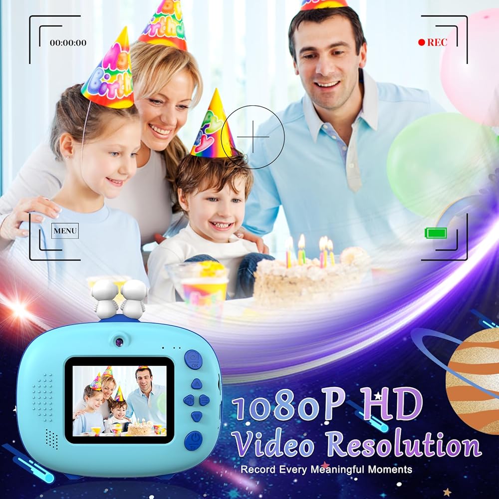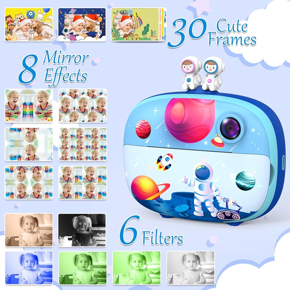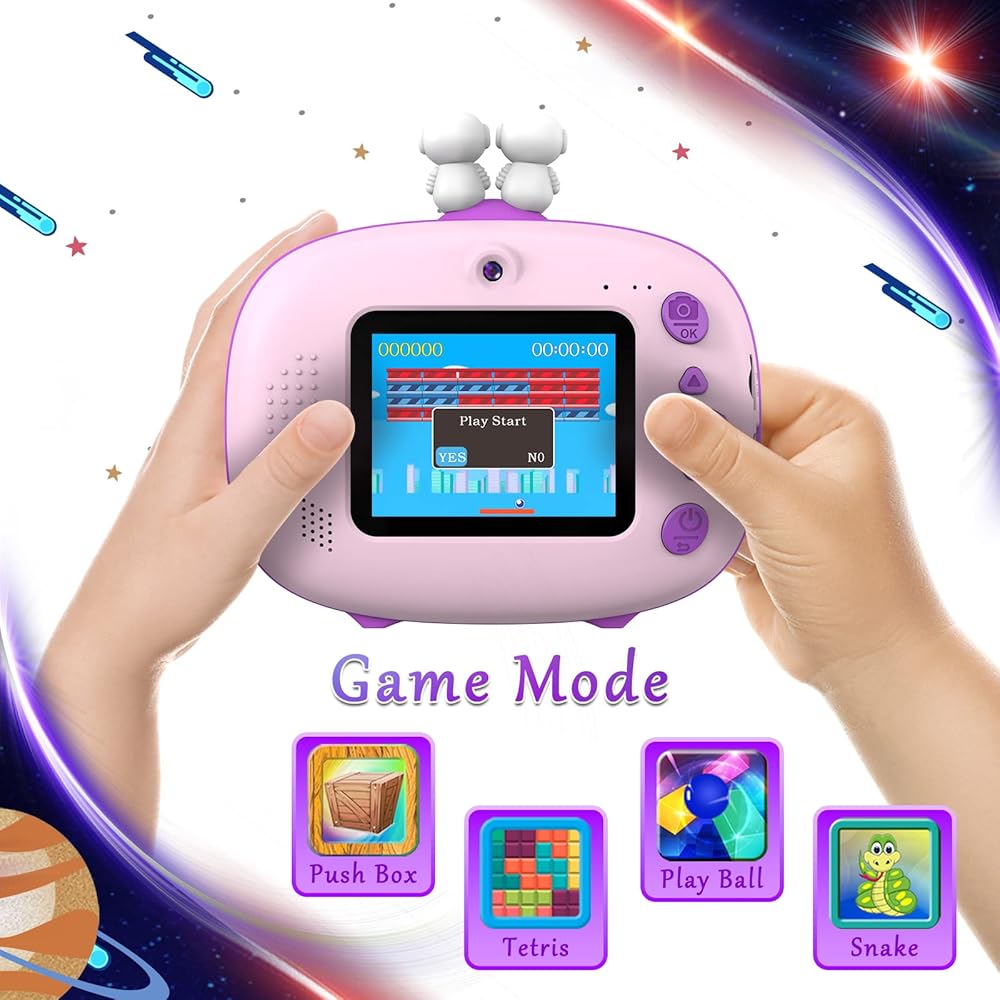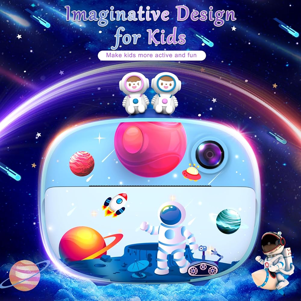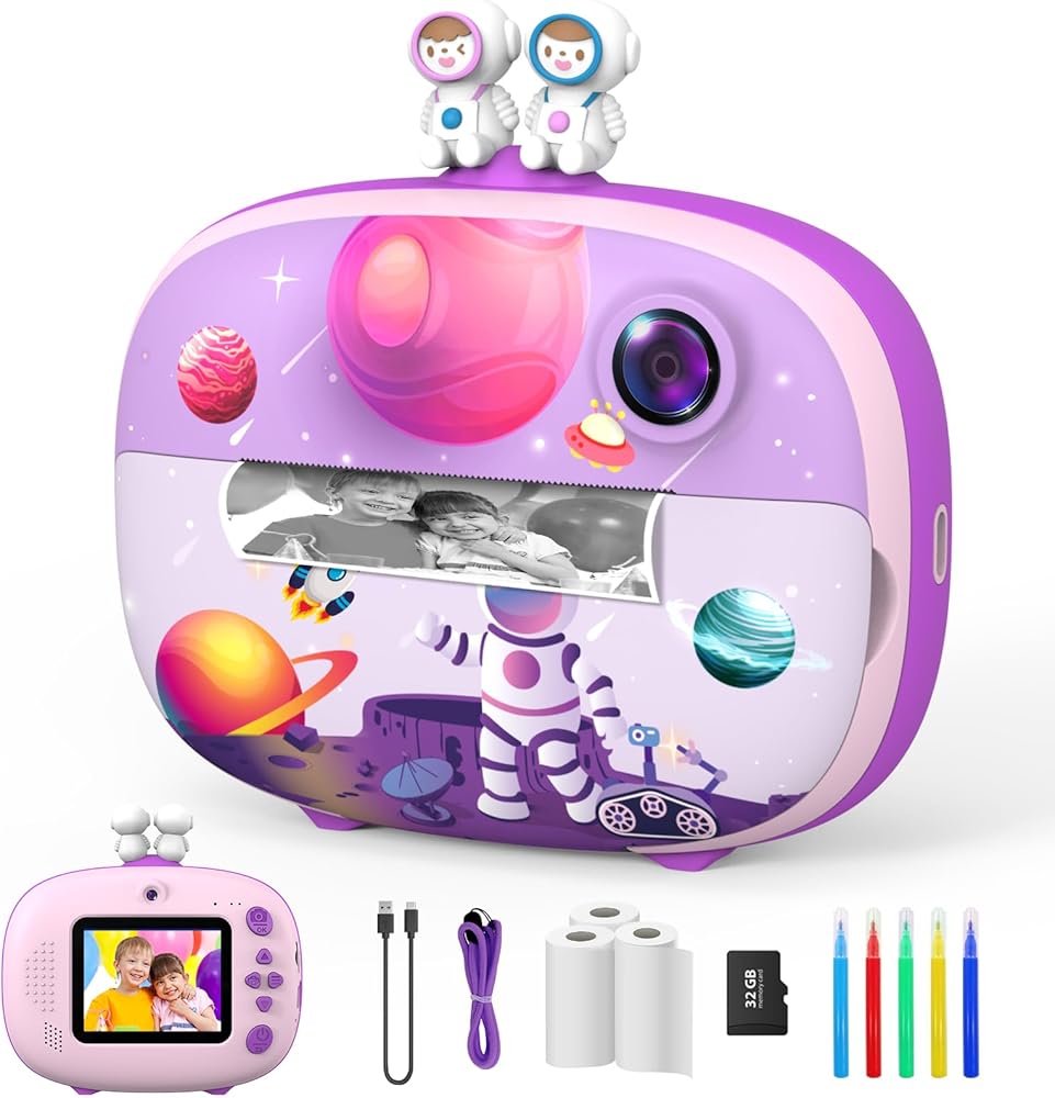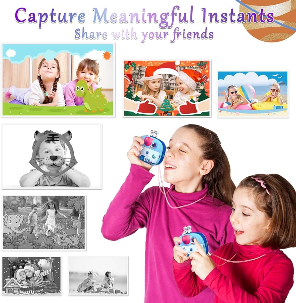 The Usteetic Kids Printing Camera is more than just a toy – it's an educational tool that sparks creativity and fosters exploration in children aged 3-12. With its 1200MP resolution and 1080p HD video capabilities, kids can document their adventures with stunning clarity. The 2.4-inch LCD screen allows for easy composition and playback of photos and videos, while the intuitive interface makes it simple for kids to navigate. Plus, with features like original photography, recording, playback, and continuous shooting, kids can unleash their creativity and capture the world around them in their own unique way. But the fun doesn't stop there – this camera also doubles as an instant printer, allowing kids to bring their photos to life in just 3 seconds. With ink-free printing technology and 3 rolls of printing paper included, parents can rest assured that their child's printing experience is safe and mess-free. And for even more creative fun, the camera can print black and white photos that kids can color with the included colored pencils, providing endless hours of entertainment. Constructed from high-quality ABS material, this camera is built to withstand the rigors of childhood play. The 1000mAh rechargeable lithium-ion battery provides up to 3 hours of continuous use, with automatic shutdown to preserve battery life. And with the included 32GB Micro SD card, kids can capture over 3000 photos or hundreds of videos without worrying about running out of storage space.