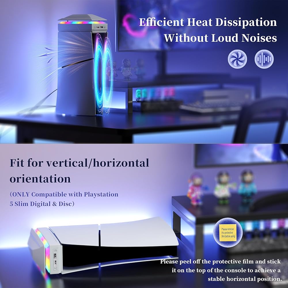 【Design for ps5 】Cooling fan for ps5 accessories integrates many functions in 1. Top cooling fan with dust-proof design, 3 gears cooling system, 7-modes RGB color light strip, extra 2 usb ports. These features not only extend the life of the console and add to the gaming experience, but also give you a cool gameplay atmosphere.(Compatible with Playstation 5 Digital & Disc Edition)