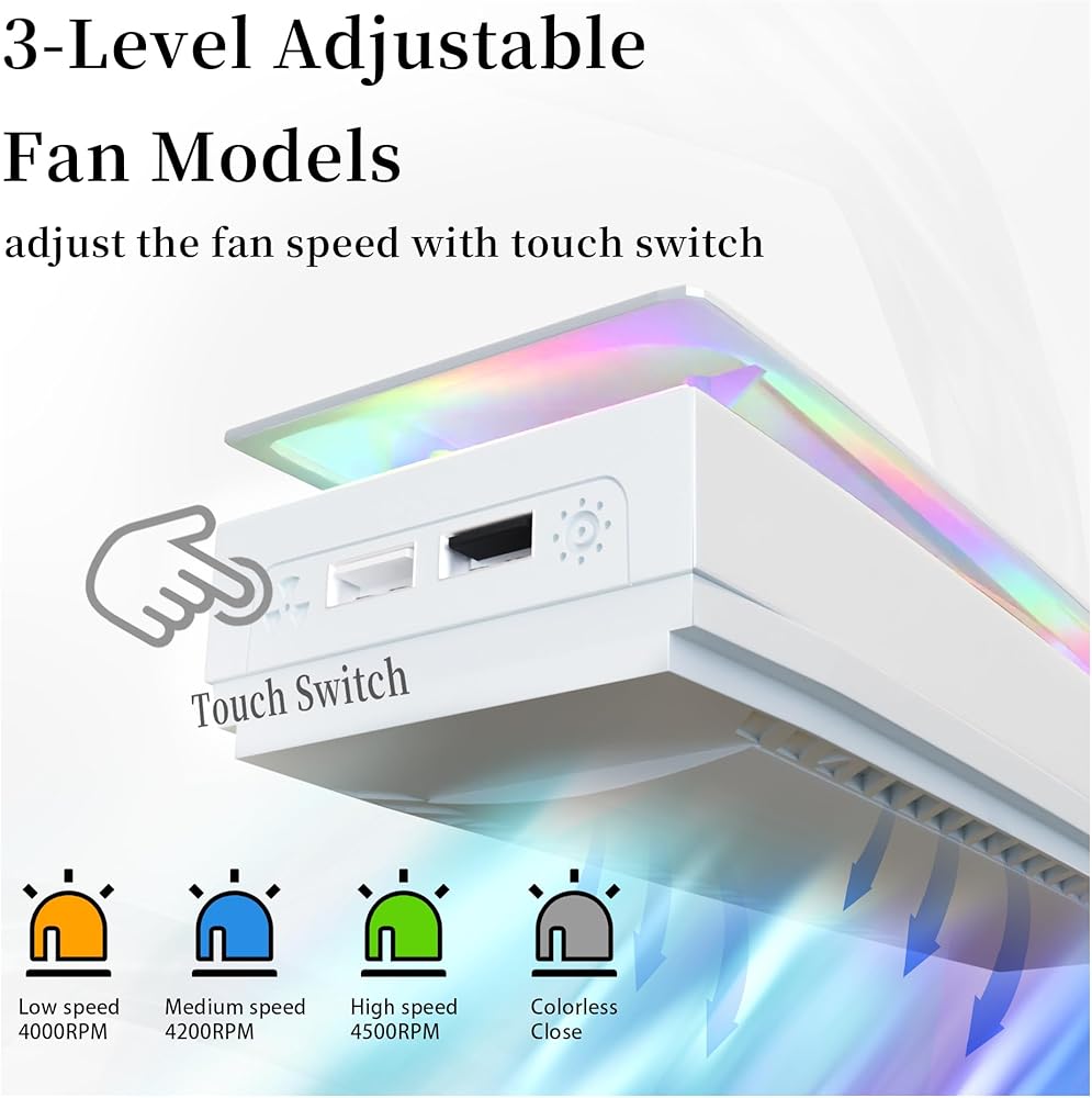 【Upgrade Top Fan System】PS5 fan cooling system built-in 2 cooling fan, which can more efficient and scientific acceleration of air intake at the top of the console and reduce the temperature. Top cooling fan with 3 level speeds-4000/ 4200/ 4500 RPM and use touch switch design. Low grade is orange, second grade is blue, and high grade is green, no light means stop, not only low noise, but also good heat dissipation.