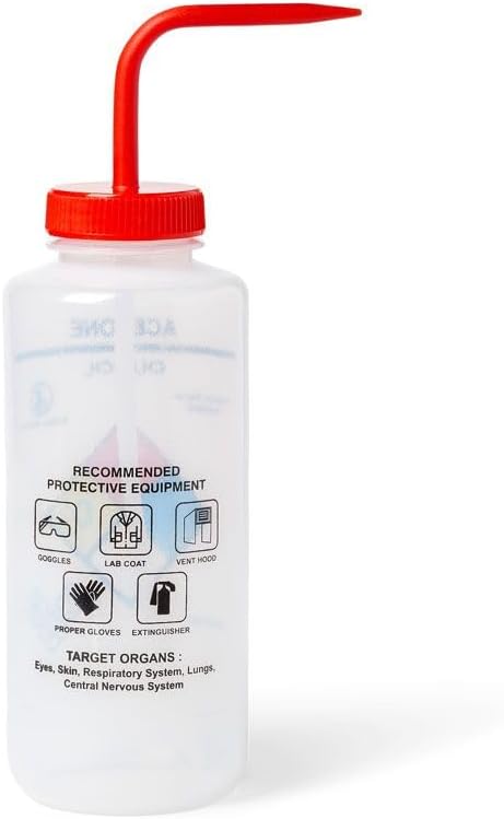 UniSafe™ vented wash bottles are made from industrial grade low-density polyethylene with polypropylene stem closure and venting assembly. They are pre-printed with the Chemical name and formula, the National Fire Protection Association (NFPA) Section 704 Four-color Diamond, health hazards, Chemical Abstract System (CAS) number, and suggested protective clothing and equipment. Each bottle is compliant with GHS and OSHA requirements outlined in Hazard Communication Standard 29 CFR 1910.1200. Intended for use only with LDPE and PP compatible solvents.
