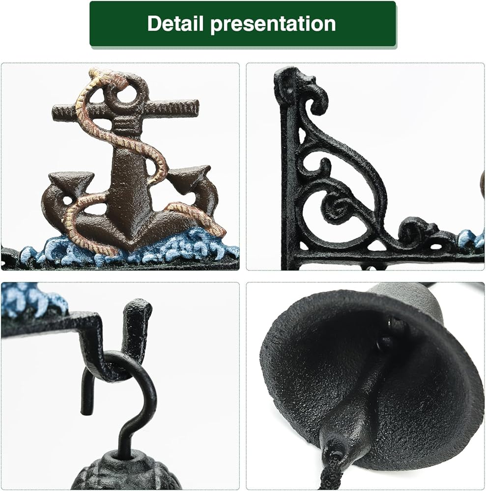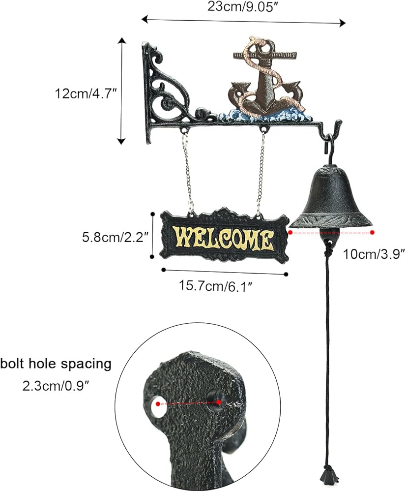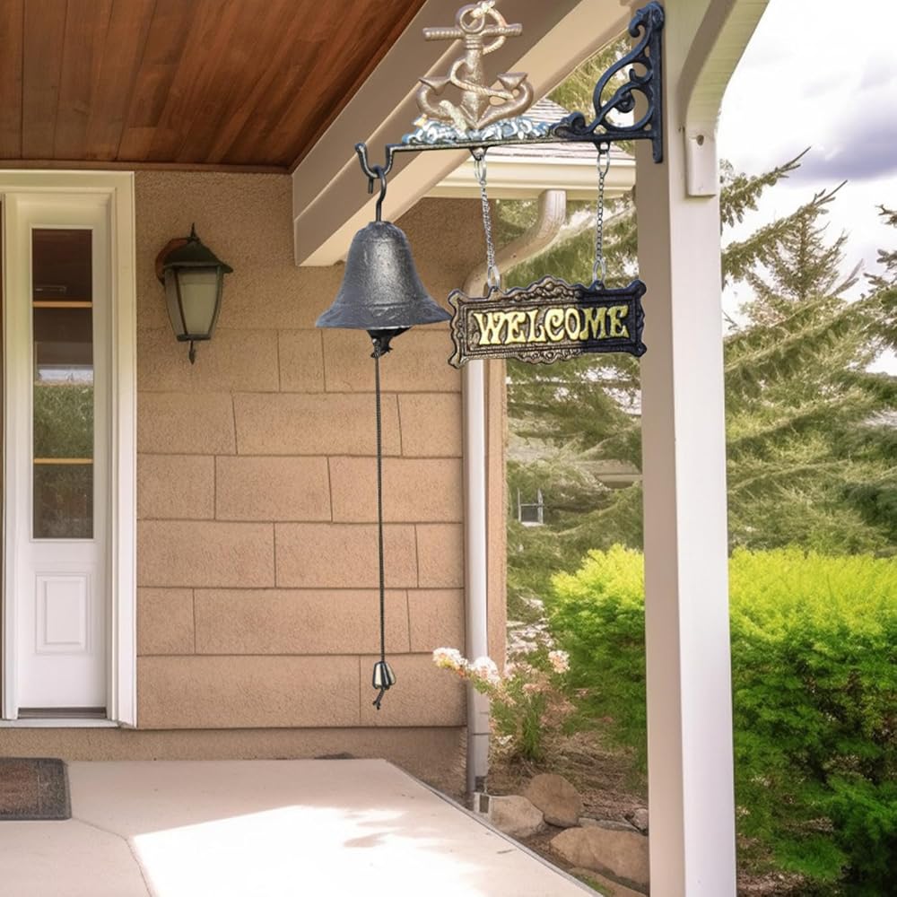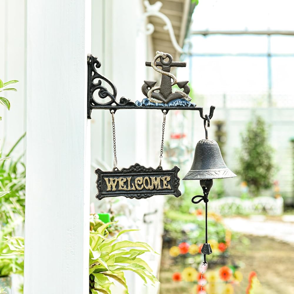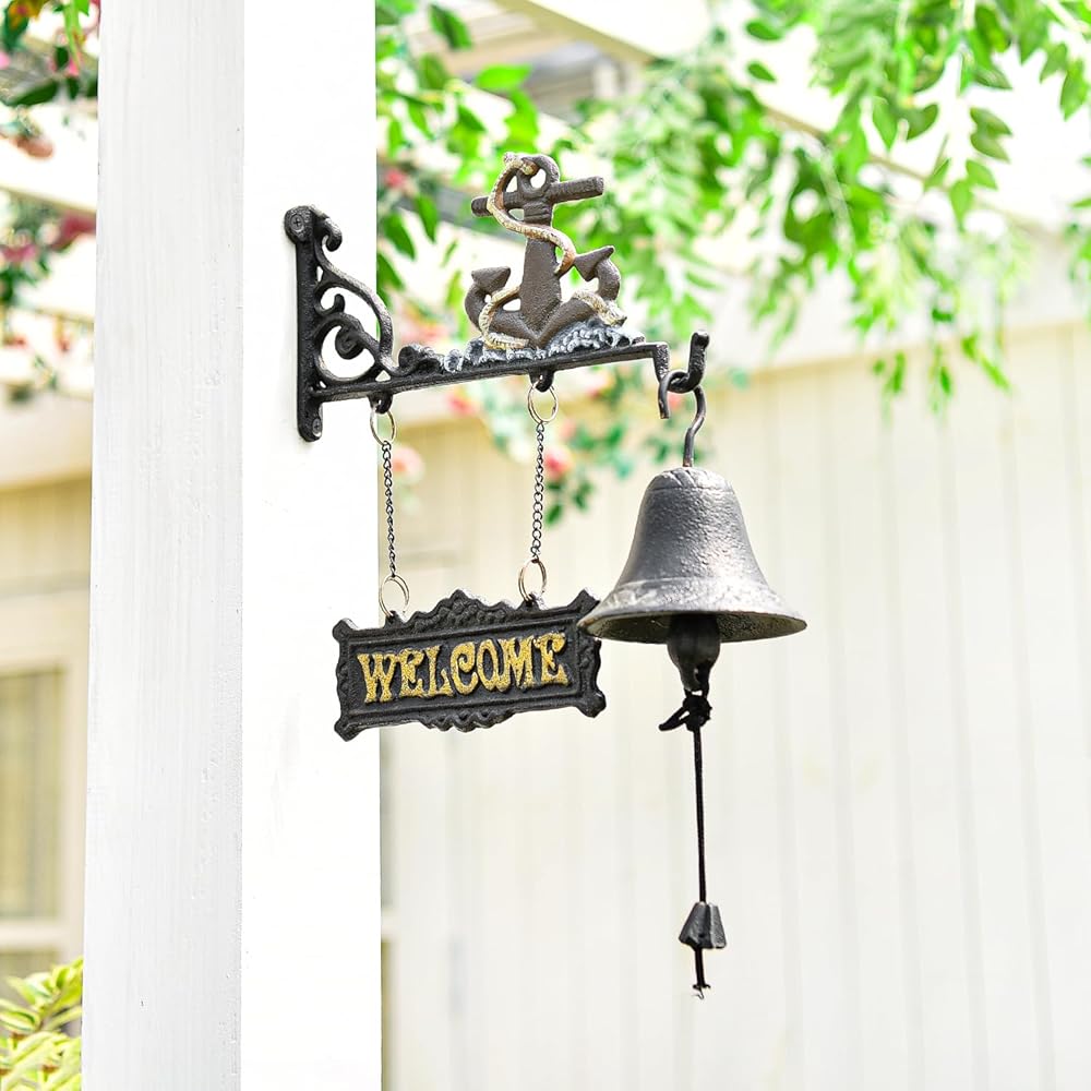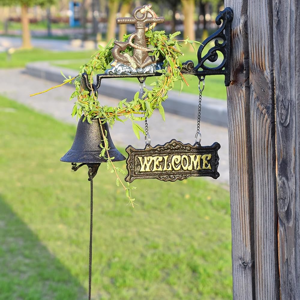 Sungmor Heavy Duty Cast Iron Wall Hanging Bell Welcome Sign - Decorative Mediterranean Style Anchor Manually Shaking Doorbell - Indoor Outdoor Wall Mounted Dinner Bell Garden Home Wall Art Decoration