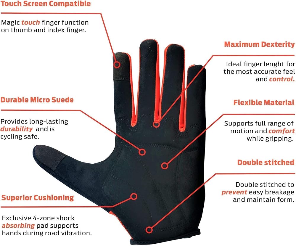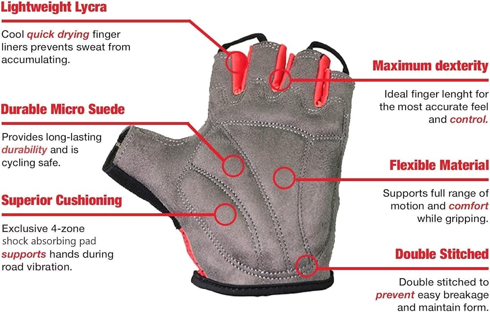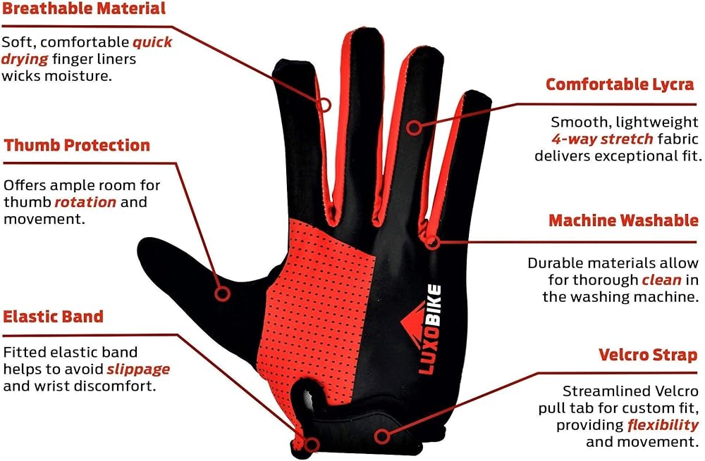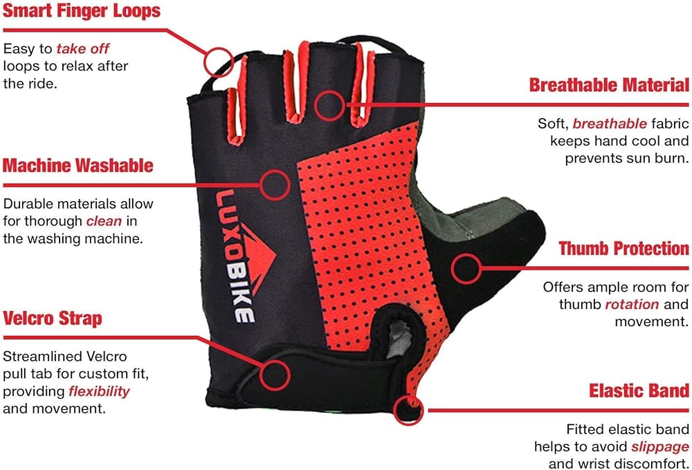 "LuxoBike Top Performance Cycling Gloves make a great choice for riding. So comfortable, you might even forget you're wearing them until you get to the end of your ride! Get a beautiful set of half finger and full finger gloves together so you're able to ride in all weather conditions. - Exclusive 4-zone Shock pads absorb vibrations and reduce pressure on the nerves to minimize risk of injury and reduce hand numbness - Micro Suede Palm for maximum grip and stability - Lightweight Cool Quick Drying Lycra mesh clothing and finger linings provide extra breathability - Soft Absorbing Thumb Towel Cloth - Streamlined Hook and Loop Pull-tab closure at the cuff allows for easy Slip On and custom fit without compromising bloodflow Measure carefully before you add to cart, so you can start enjoying right away! Our gloves are generally snug-fitting. If you're in between sizes, we recommend that you choose the larger of the two sizes. If you prefer looser fitting gloves, buy one size larger."