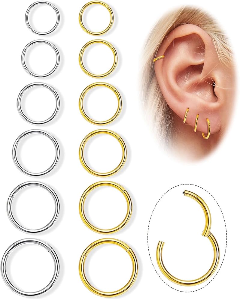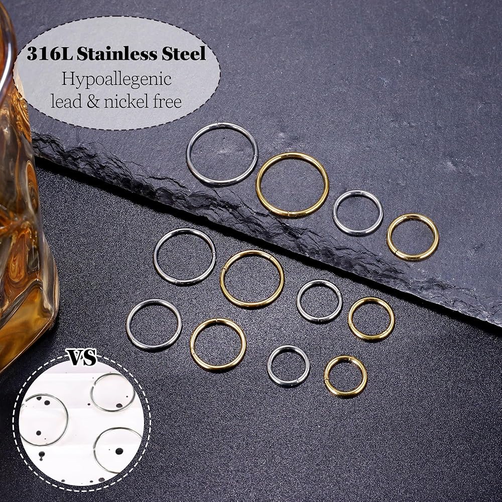 【16G Septum Nose Rings】: One order comes with 12pcs clicker septum nose rings in different sizes. These classic and timeless clicker septum rings have multiple uses, such as septum piercing, cartilage earrings, helix earrings, lip rings, daith earrings, tragus piercing, etc.