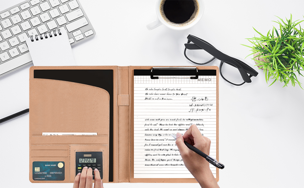 Lemical Provides High-quality Products --- Faux leather with comfortable touch, smooth and soft; Tight stitching inside to ensure that the pocket will not break easily; Hardware clip, not easy to rust, strong elastic, can hold 60 to 80 sheets of A4 paper; 8-digit calculator, silicone keys, body made of ABS plastic, sturdy and durable.