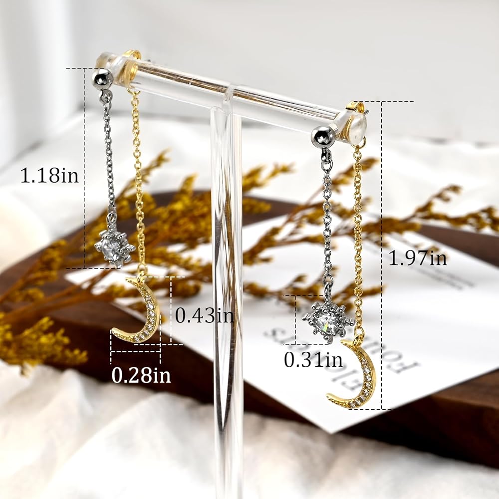 [Comfortable to wear] These sun and moon earrings are small and lightweight. The size of the star pendant is 0.3 inches * 1.18 inches, and the size of the moon pendant is 0.3 inches * 1.97 inches. These crescent moon earrings are made of lightweight materials that do not burden the ears and are easy to put on and take off.