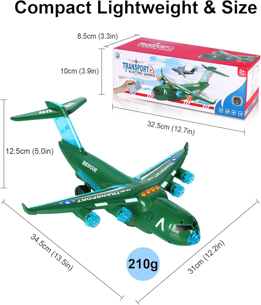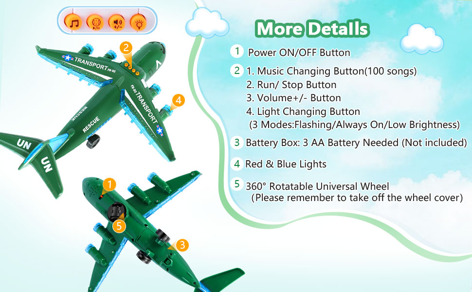 Bump and Go & Real Planes Sound Effect: This plane toy is an advanced modern toy which has a smart 'Bump and Go' action. Anytime it is about to hit an obstacle, it turns right and will re-route its direction. Having fun with an authentically styled model airplane, the toy planes for boys feature a real, spinning propeller, it comes alive with sounds and phrases, so kids can create realistic adventures. Note: Batteries are not included in the package