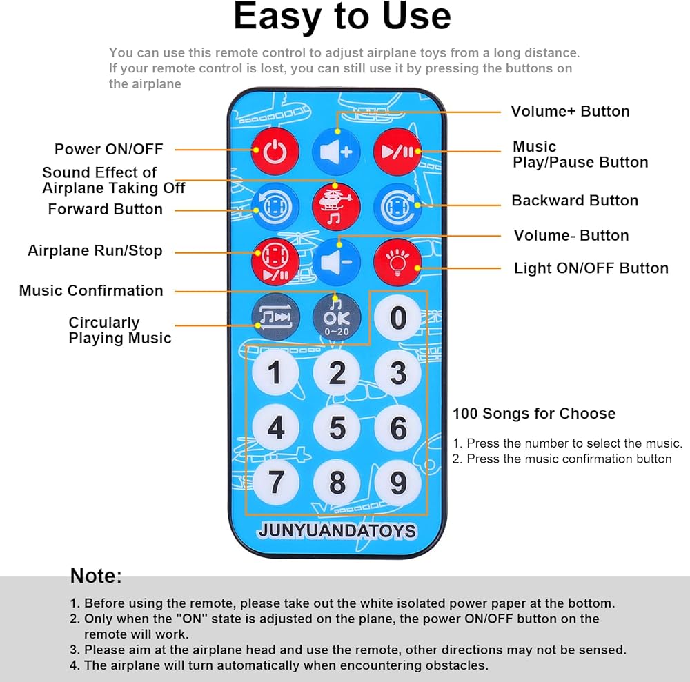 Remote Control & Light & Music: This baby airplane travel toys have an attached remote controller, which is used to change 3 lighting effects and musics. The lights on the tail of airplane toys for toddlers can be adjusted with 3 modes (flashing/ always on/ low brightness), and there are 100 songs to choose from, which can be played circularly, so as to promote kid's listening development and enable kids to be exposed to a variety of sounds in the early learning stage