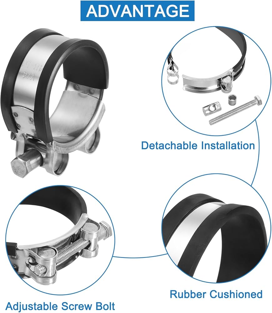 [Easy to Install]: It is convenient to install the t-bolt hose clamp. Just place it on the pipe or pipe fitting that needs to be connected, and adjust the size by turning the screw or loosening the screw to make it tightly fixed.