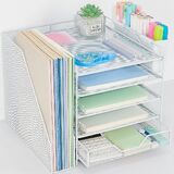 🎁📝【Save Space】The Gugsey Desk File Organizer has 5-tier paper letter tray + vertical file holder + hanging pen holder + sliding drawer, which is enough to accommodate all office supplies and office desk accessories. Office organization are designed to help you keep your desk tidy and clean, reduce work anxiety and increase happiness.