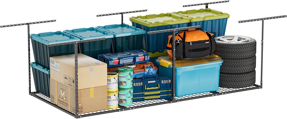 MORE SPACE: Meet your storage needs with a ceiling mounted garage storage system for storing unused items. This hanging storage system is a great space saver, providing you with more storage space and better organization.