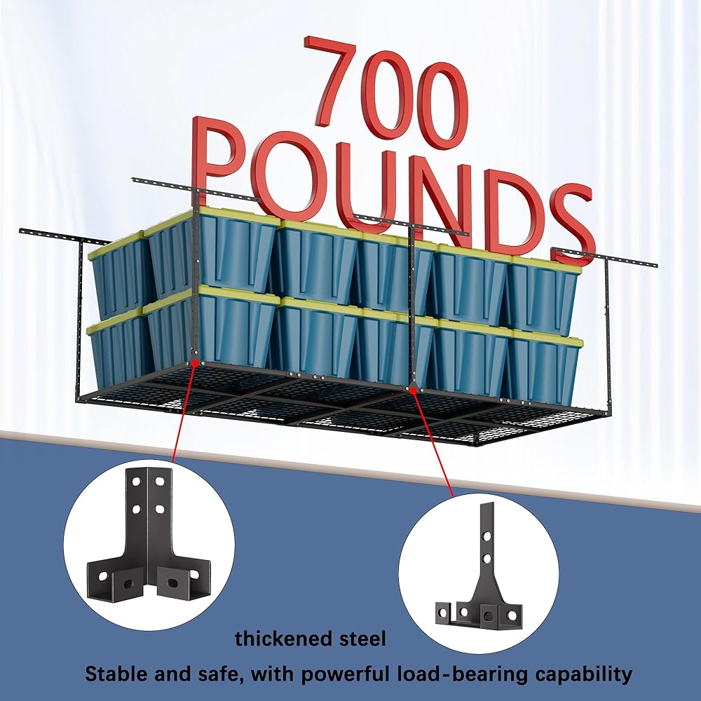 HIGH QUALITY: Garage ceiling storage racks can hold up to 600 pounds and are perfect for storing bikes, lockers, sports equipment, holiday decorations, and more. The powder-coated finish is waterproof.