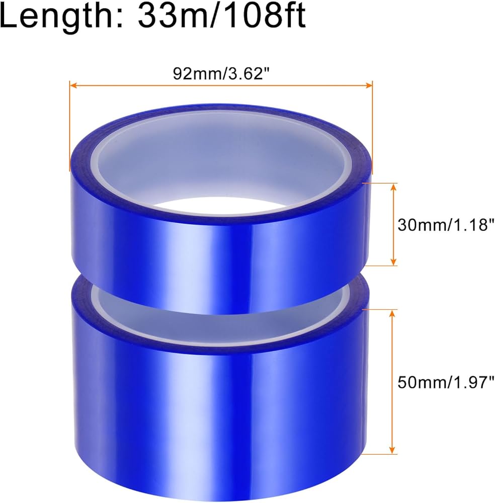 Size - Width: 30mm/1.18", 50mm/1.97"; Length: 33m/108ft; Thickness: 0.06mm; Heat resistance: Short period Heat Resistance:260℃(500°F); Long period Heat Resistance:220℃(428°F)