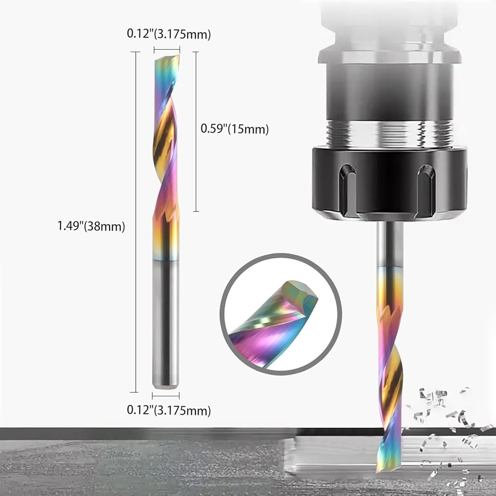 ❇️Spiral Router Bits Dimensions -- Shank Diameter: 1/8 inch (3.175mm); Cutting Diameter: 1/8 inch (3.175mm); Cutting Length: 0.59 inch (15mm); Overall Length: 1.5 inch (38mm); Material: Tungsten Steel. Please choose a cutting length that exceeds the board by 2-5mm, or it will result the end mill breaking.